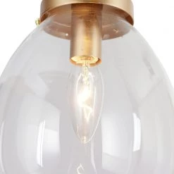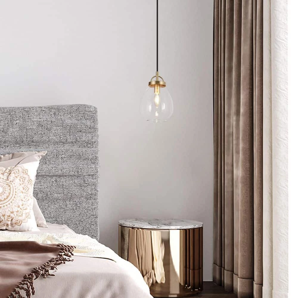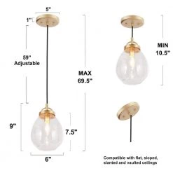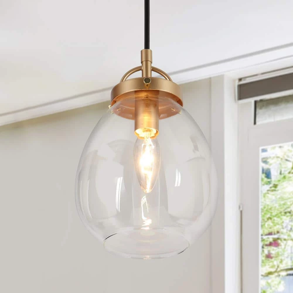 Featuring a deep gold finish and a rounded oval/bulb-shaped clear glass shade, this sleek modern farmhouse pendant light presents delicacy and cuteness. With a widely adjustable hanging wire, the indoor hanging pendant light fully allows you to conduct your DIY ideas on mounting it as a unique island chandelier with several in a row, or a semi-flush mount ceiling light. It is ideal for your entryway, hallway, staircase, bedroom, dining room, and kitchen island, providing bright lighting.