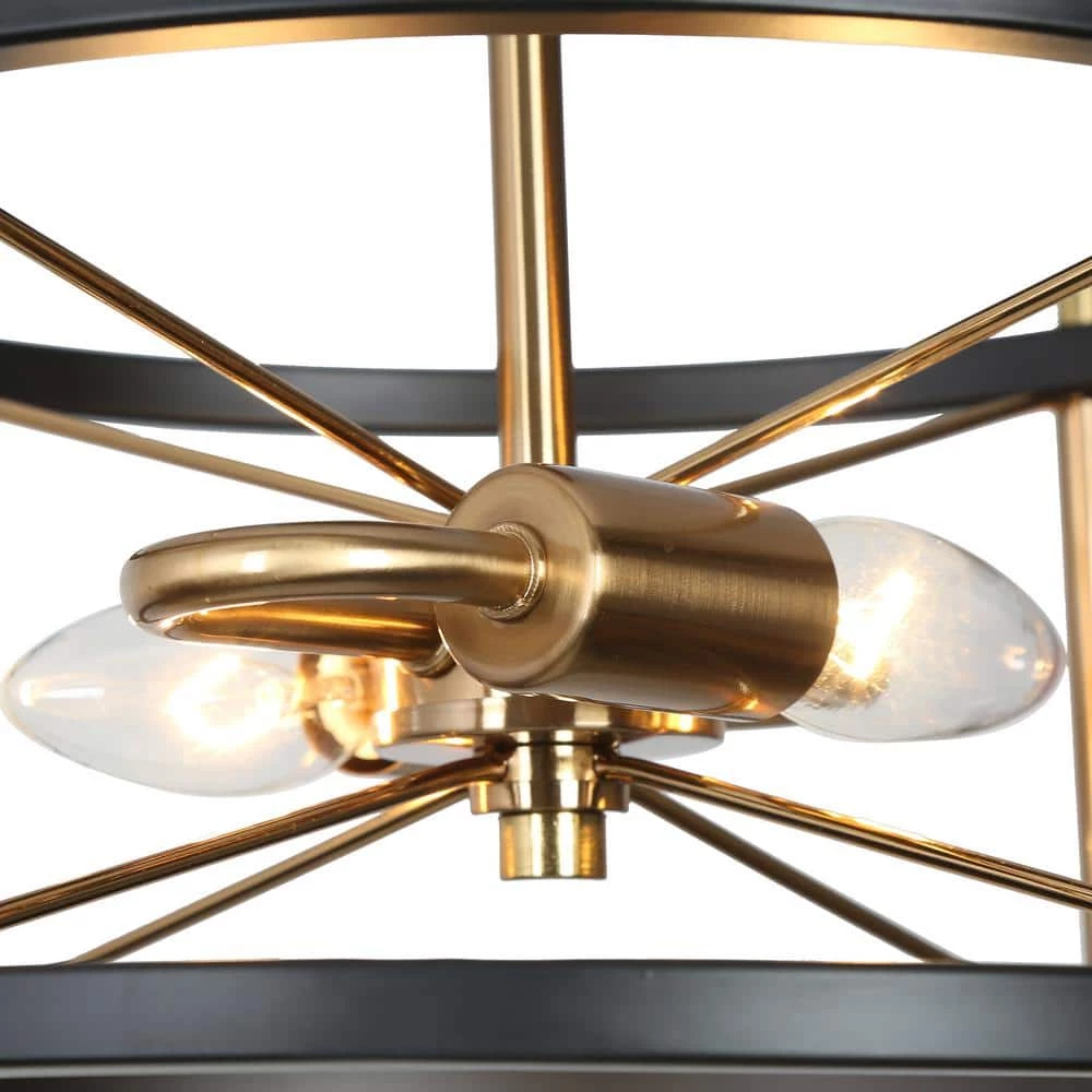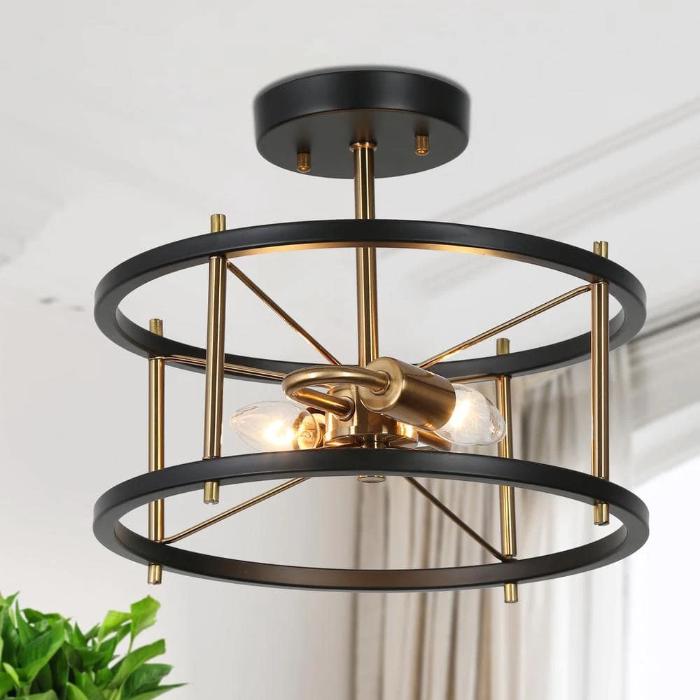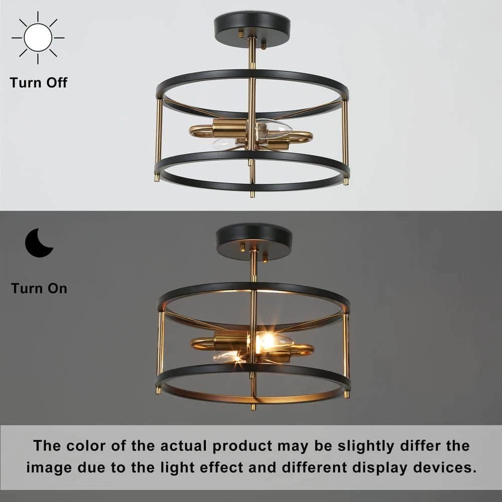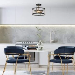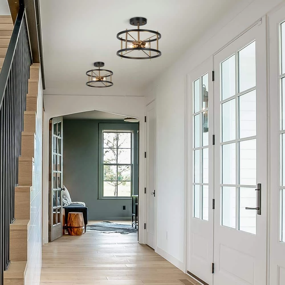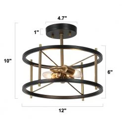 Full of a sense of modernity and technology, this 2-light round semi-flush mount with a futuristic design is an innovative light fixture to modernize and update your house. Features crossed design of black circles and brass metal bars, this modern industrial flush mount ceiling light with a minimalist cage presents a feeling of neutral simplicity, ideal for your stairway, bedroom, kitchen island, dining room, hallway, entryway, storage room, and any suitable place. The simple round construction is convenient for bulb replacement and cleaning as well as provides ample bright lighting for your space.