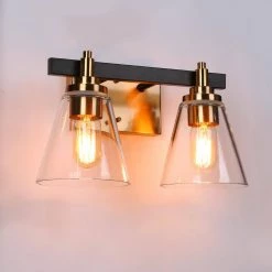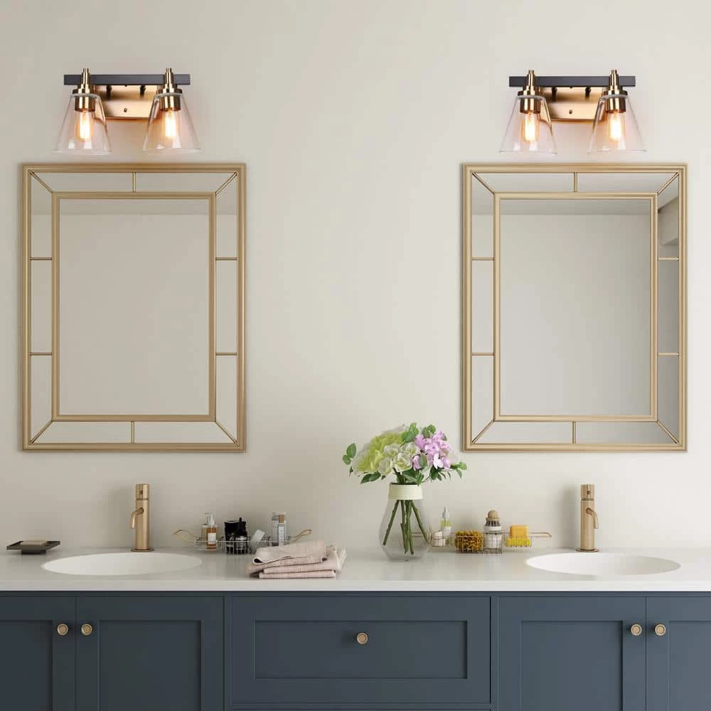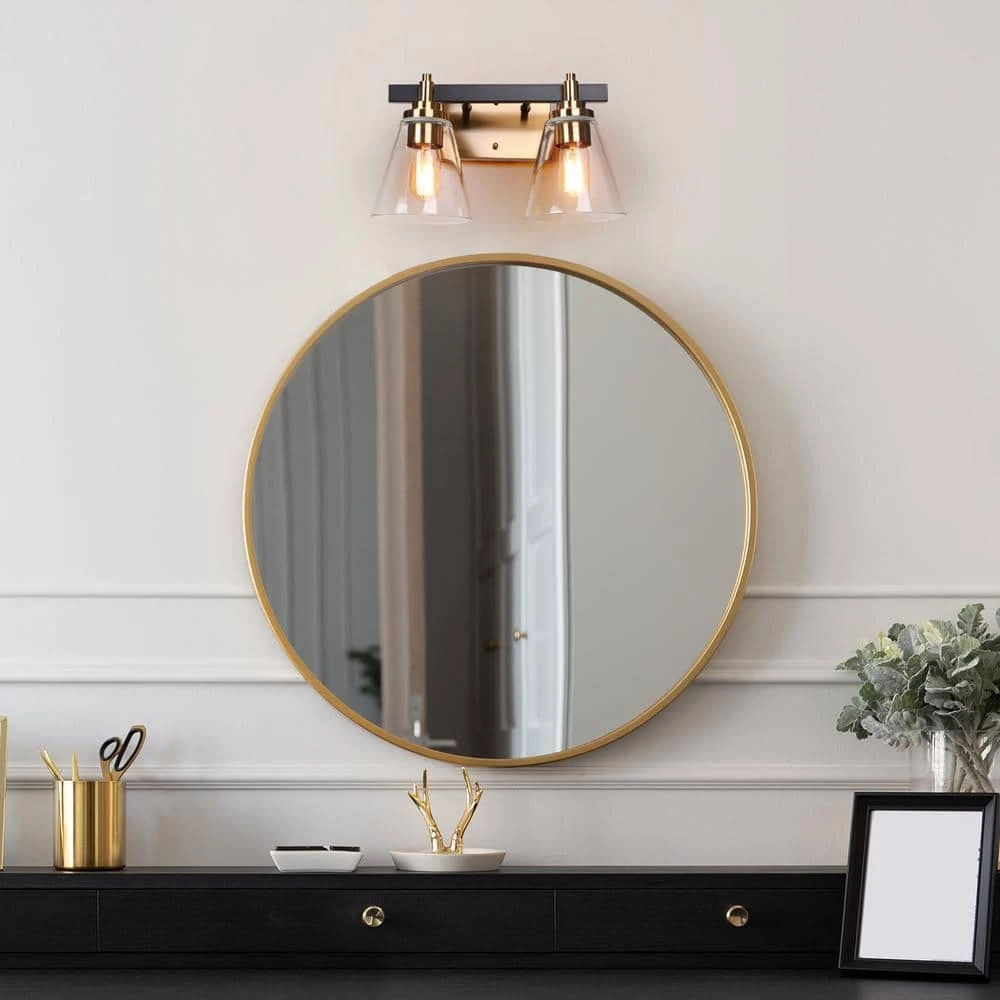 A shiny modern look to enliven your home decoration. This 2-light brass-plated vanity light is a novel brilliant lighting fixture to enhance any contemporary, transitional, farmhouse, or industrial house decorations. With a highly polished brass gold and vintage black finish, the simple bath bar vanity light is suitable for your bathroom, powder room, hallway, entryway, and kitchen to pair with mirrors, sinks, artworks, and storage shelves. Working with a standard dimmer switch and dimmable bulbs (both not included), this transparent wall light is nice to provide bright customized lighting.