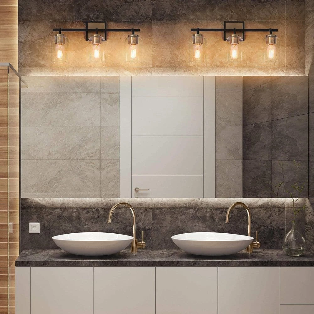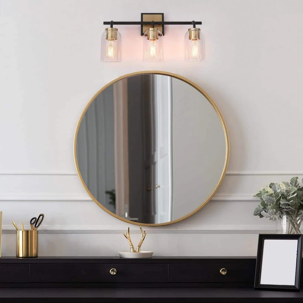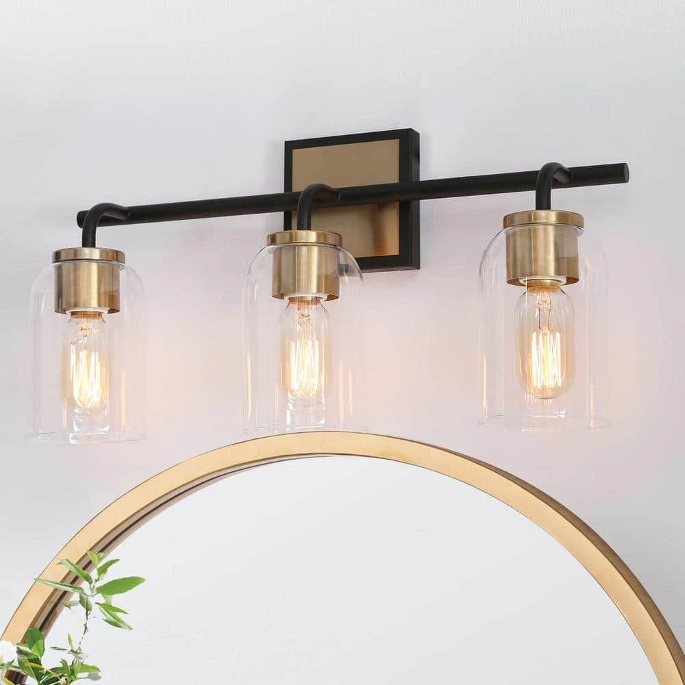 Consisting of a slender metal bar and individual curved arms, this 3-light bath bar vanity light is a perfect blending of modern, classic, and traditional elements, bringing a new modern yet vintage look for your house decor. The black frame on the outside of the brass canopy and the no-exaggerated curves present careful design in detail and make the wall light more distinctive. With clear glass shades and higher compatible bulb wattage (60W maximum), there is no worry about the brightness in your bathroom, powder room, entryway, and any other space you want to update.