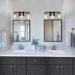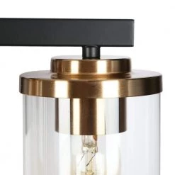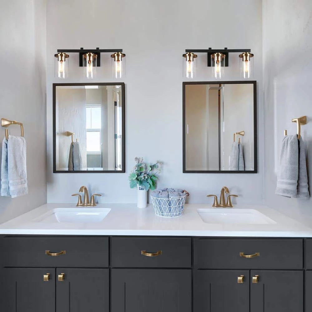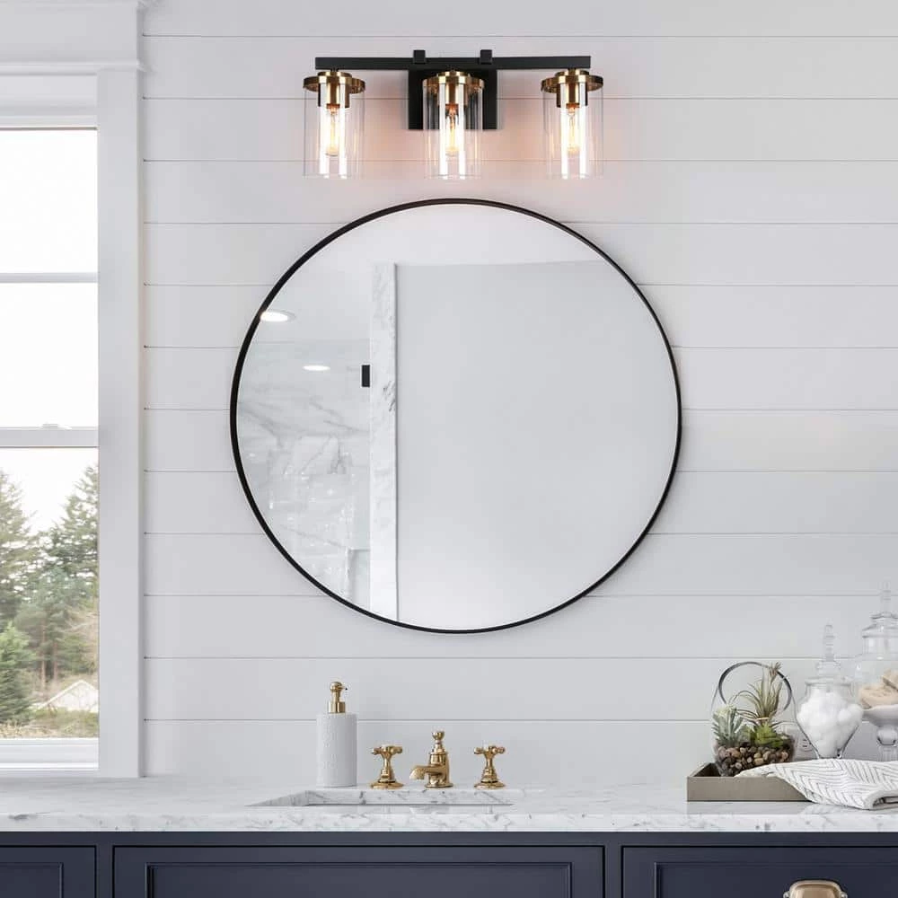 Update your house with this innovative 3-light vanity light for the bathroom. Combining vintage black and shiny brass, this modern industrial wall sconce is a new and distinctive lighting fixture to complement modern, transitional and industrial house styles, embellish and brighten your indoor space. The cylinder clear glass shades with wider diameters help to provide ample bright lighting while the brass-plated finish ensures its timeless luster. The transitional black wall sconce lighting is a nice choice for your bathroom, powder room and entryway, perfect for matching your mirrors and artworks.