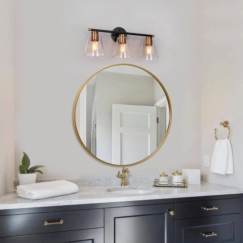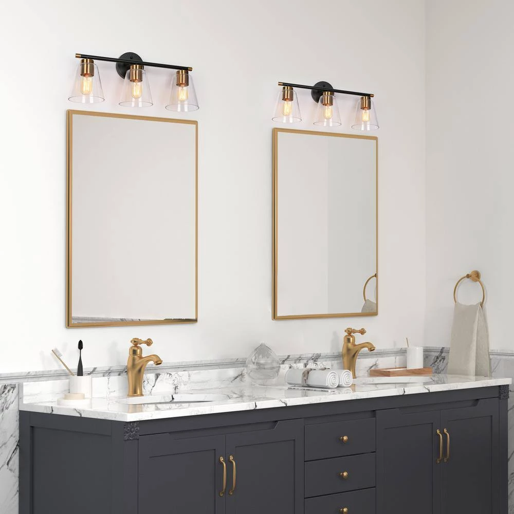 Timeless black bath vanity light with modern bright brass accent is a wonderful neutral light fixture to decorate and light up your house. This 3-light vanity light featuring an outstanding plating finish is durable in any damp area and presents a permanently bright and futuristic appearance. Cone design makes it collocate well with any shape of the mirror while black and brass gold will make your house decoration more sophisticated and high-class. Believe you will love this stylish wall sconce lighting and it will update your bathroom, powder room, and any other suitable space, bringing you a new decoration experience!