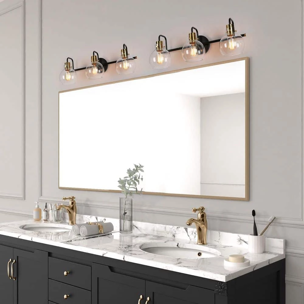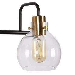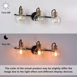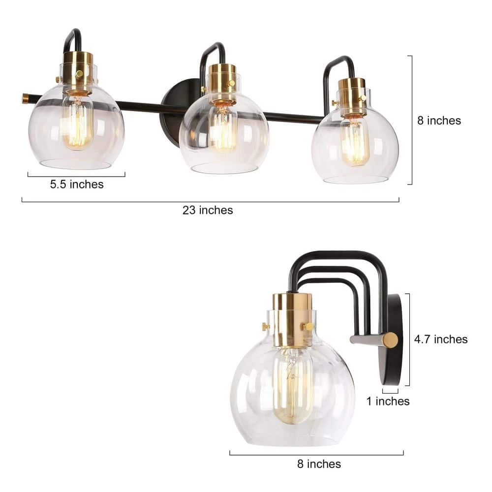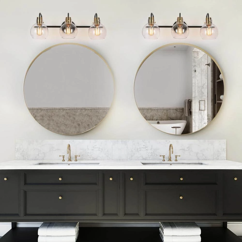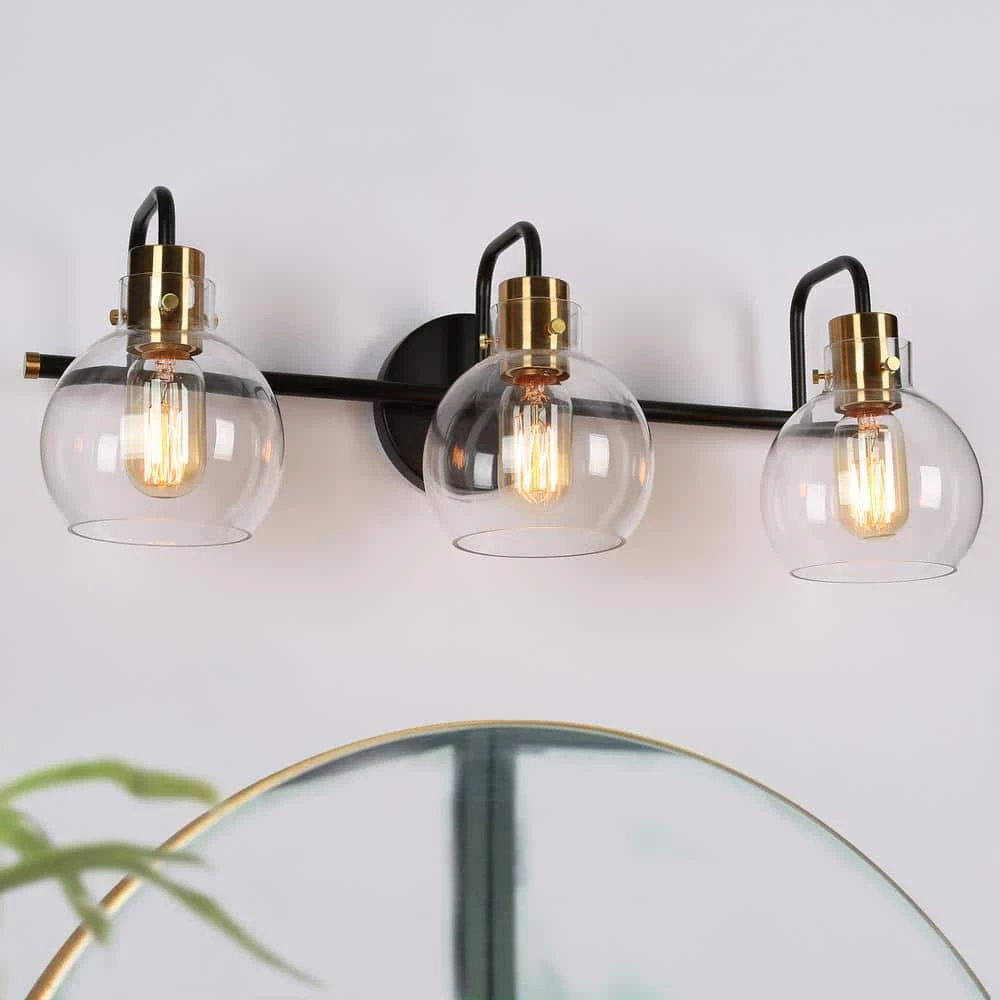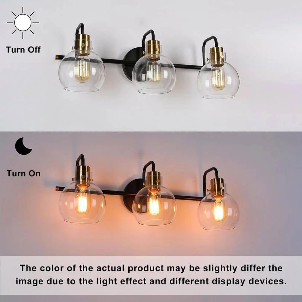 A vintage black and bright polished brass wall light features unique bottom-opening globe glass shades. This 3-light bath vanity light combining modern and industrial elements is suitable for most house decorations. With transparent globe shades, this classic bath bar vanity light is a nice choice for your bathroom and powder room to collocate with mirrors, providing adequate bright lighting. Whether mounted up or down, the clean lines and shiny brass accent will make it highlight your space.