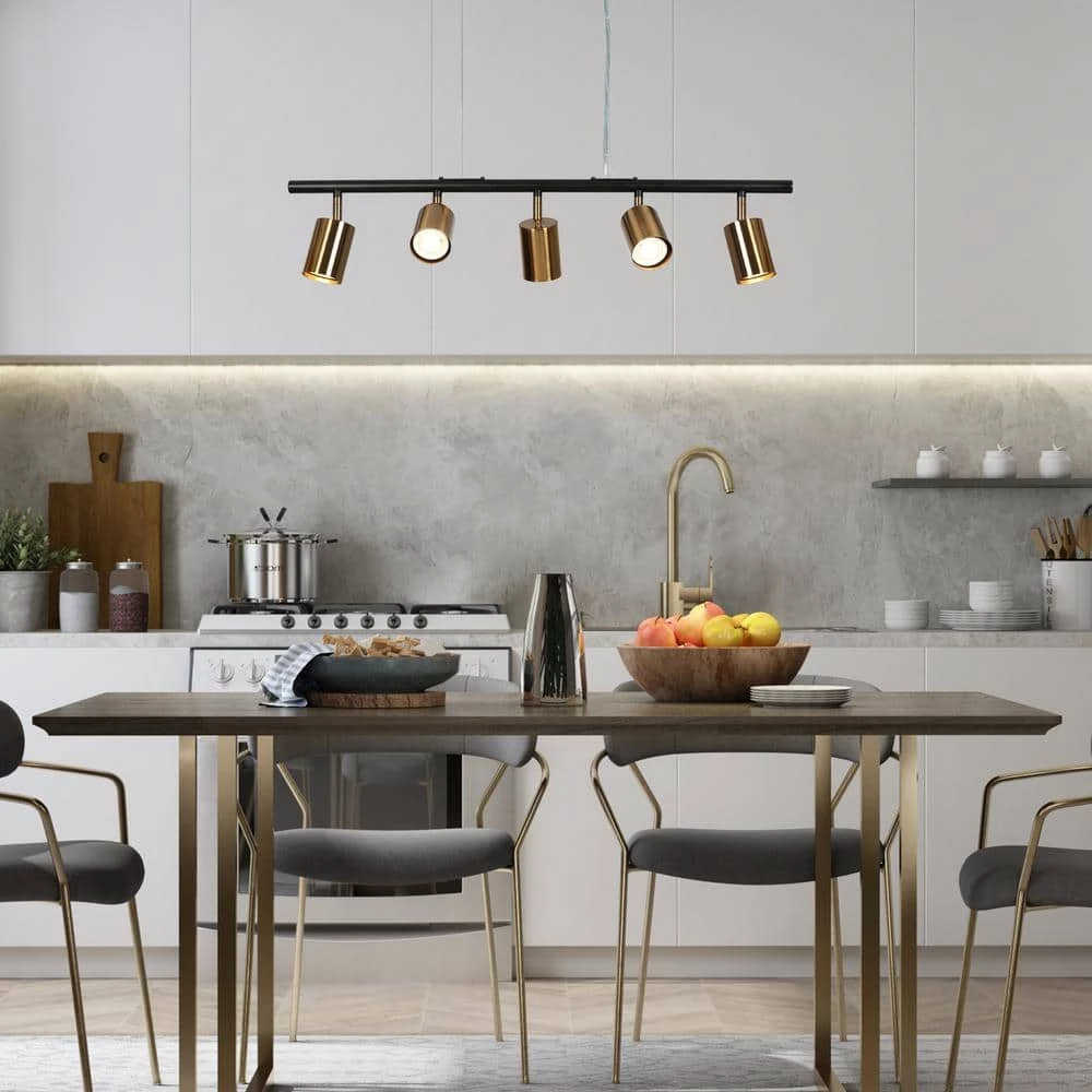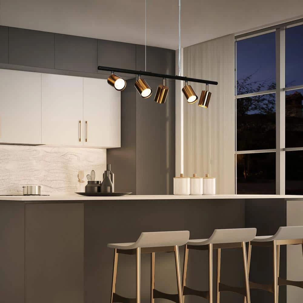 Reveal a minimalist and refined life attitude with this Adjustable Modern Black Pendant Hanging Lights, 5-Light Brass Gold Linear Island Chandelier with Metal Shade. Featuring a plating brass and vintage black finish, this understated yet delicate black pendant light is a fabulous choice for the kitchen island and dining room, creating a simple but stylish space. With adjustable lamp heads and steel wires, this modern industrial island chandelier perfectly meets your multi-directional lighting needs and allows you to install at a perfect height to make your house much more sophisticated.