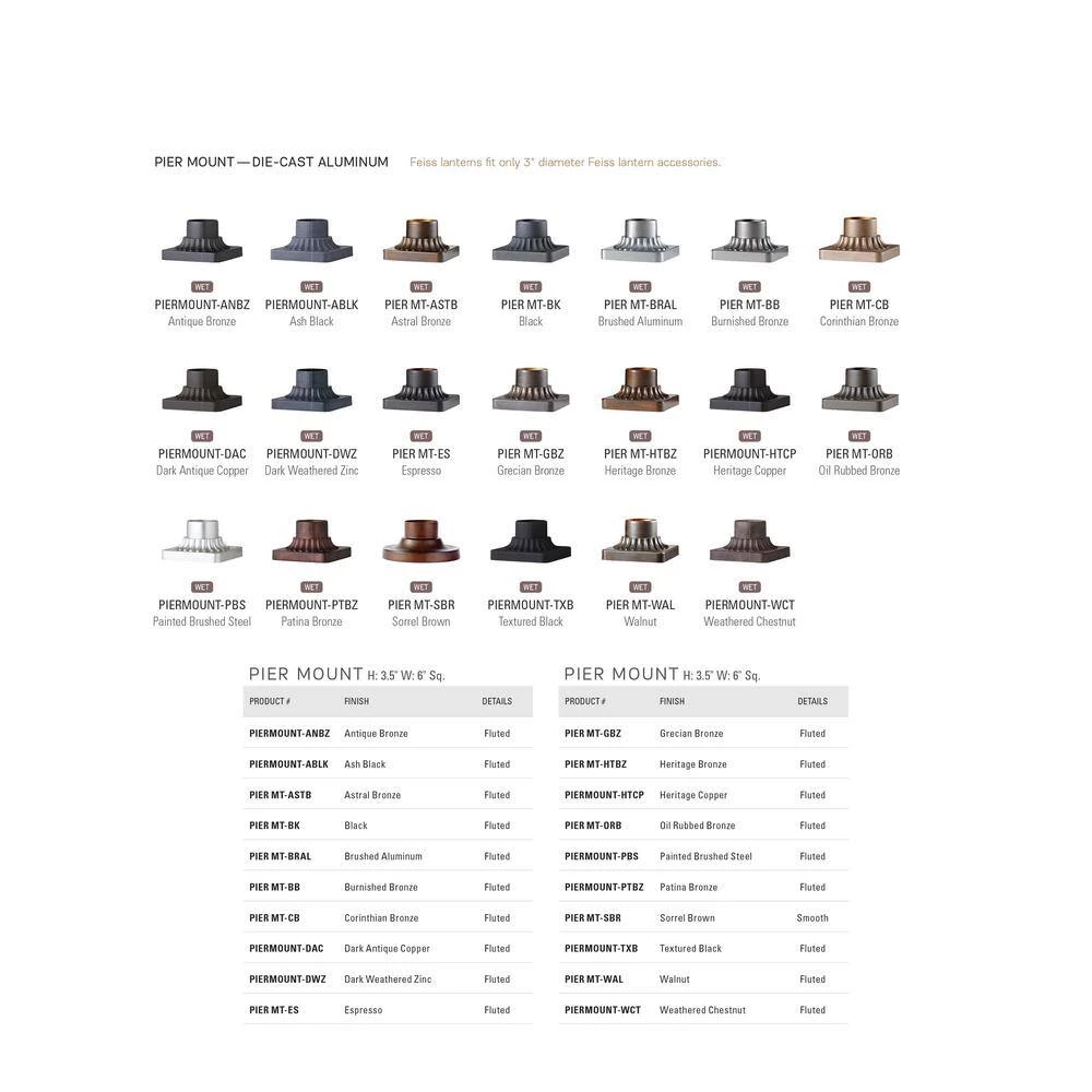 The Feiss Lighting pier mount accessory creates a warm and inviting welcome presentation for your home’s exterior. Utilize this 3 in. Dia pier mount to coordinate with Feiss Lighting post top lanterns. This is the pier mount only and does not include the light fixture.