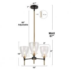 Create a new-fashioned, understated stylish house decoration with this 3-Light Black Round Chandelier for Dining Room, Transitional Brass Gold Pendant Light with Cone Clear Glass Shades. With a simple triangular design and bell-shaped clear glass shades, this 3-light round pendant hanging light is fantastic to embellish your kitchen island, living room, bedroom, foyer, entryway, providing very bright lighting. The adjustable down rods allow you to install this rustic black chandelier lighting at a suitable height to present a perfect visual effect.