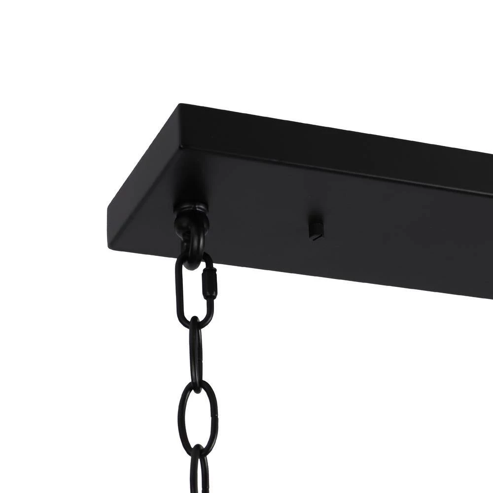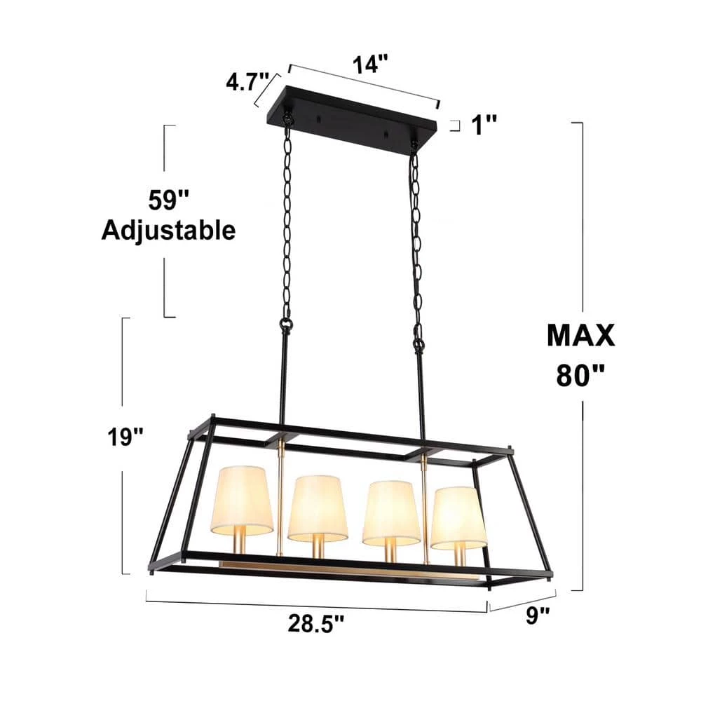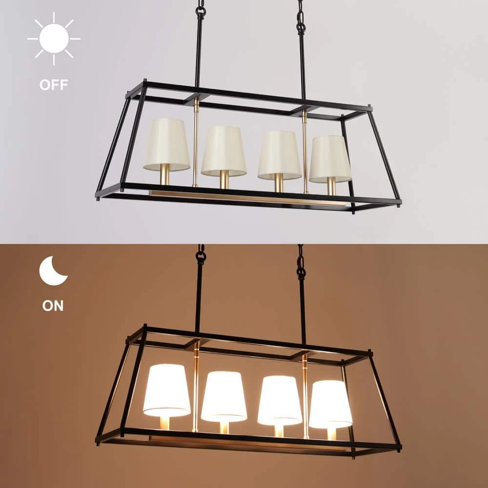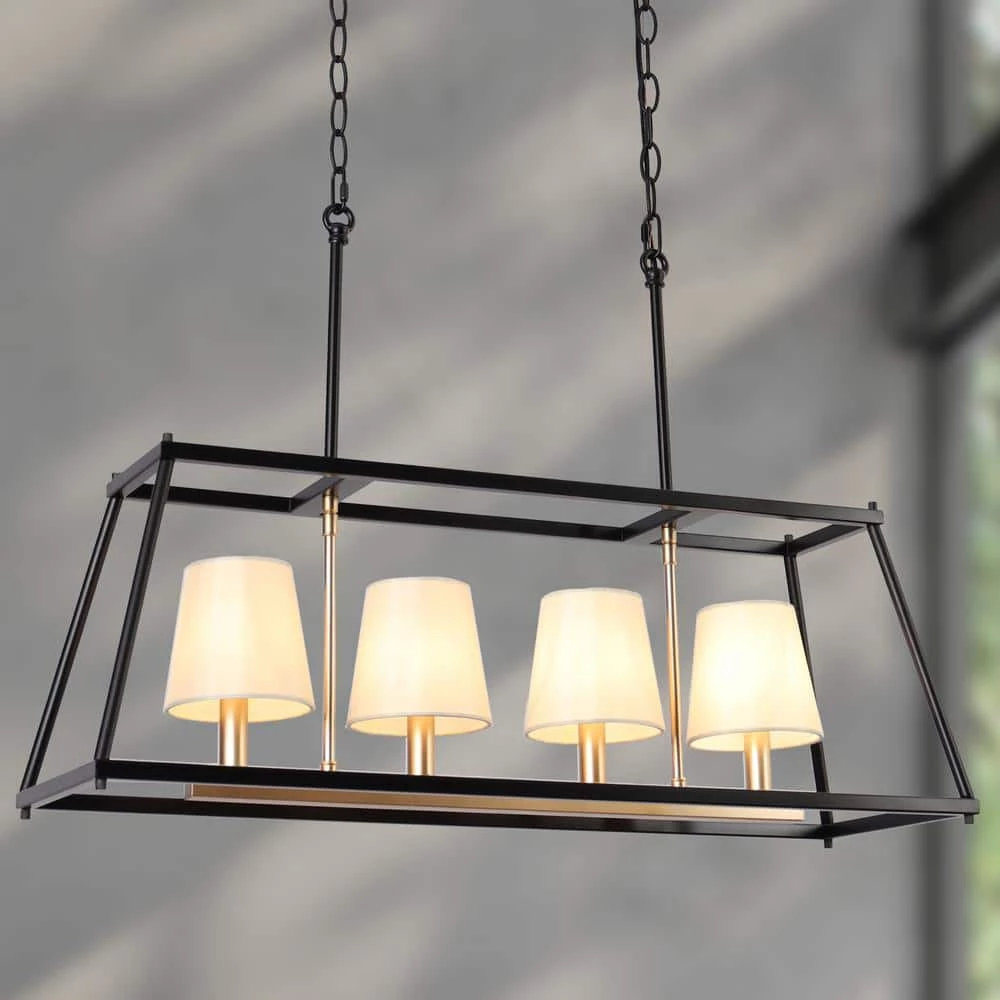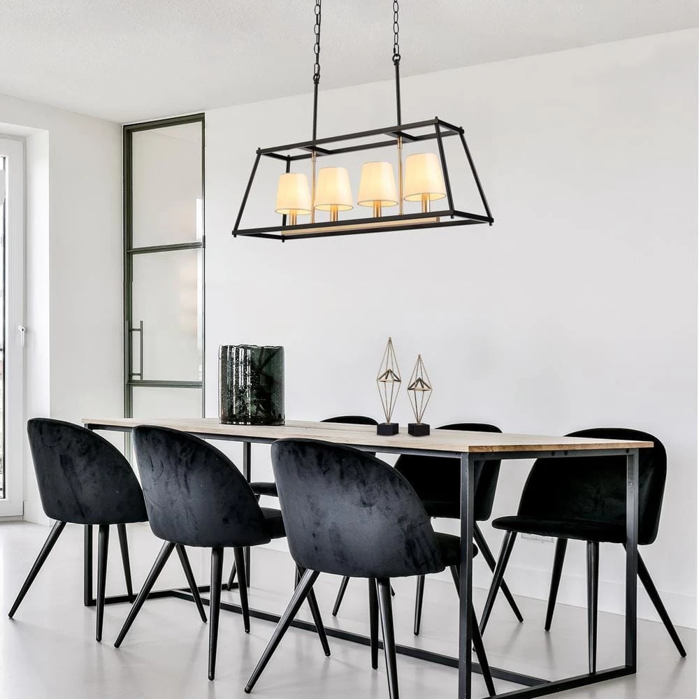 Neutral yet elegant, this 4-light island chandelier is a harmonious combination of industrial and mid-century modern styles. The black geometric frame presents a high-class feel while the dark gold lamp holders with off-white fabric shades add a hint of modern elegance and sophistication. With adjustable black hanging chains, this contemporary chandelier can be installed at a suitable height, meeting your different lighting needs for both low and high ceilings, and the rectangular design is perfect for your living room, bedroom, dining room, and kitchen to provide adequate soft brightness. Believe this black chandelier will make your house decoration more distinctive and bring you a different visual experience!