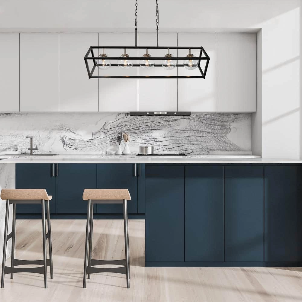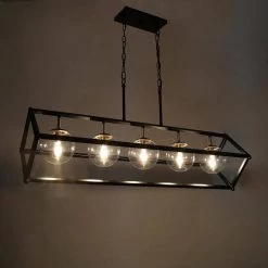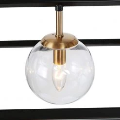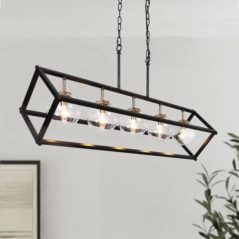 The sloping rectangular frame with globe glass shades inside makes the whole modern farmhouse chandelier full of creativity. This black and brass hanging pendant light blending modern, industrial, and classic elements is a nice fixture to update various house decorations. With adjustable black hanging chains, this industrial chandelier can be installed at a suitable height, meeting your different lighting needs for both low and high ceilings, and the large rectangular design is perfect for your kitchen island, living room, dining room, foyer, hallway, and any large space, providing you with adequate brightness.
