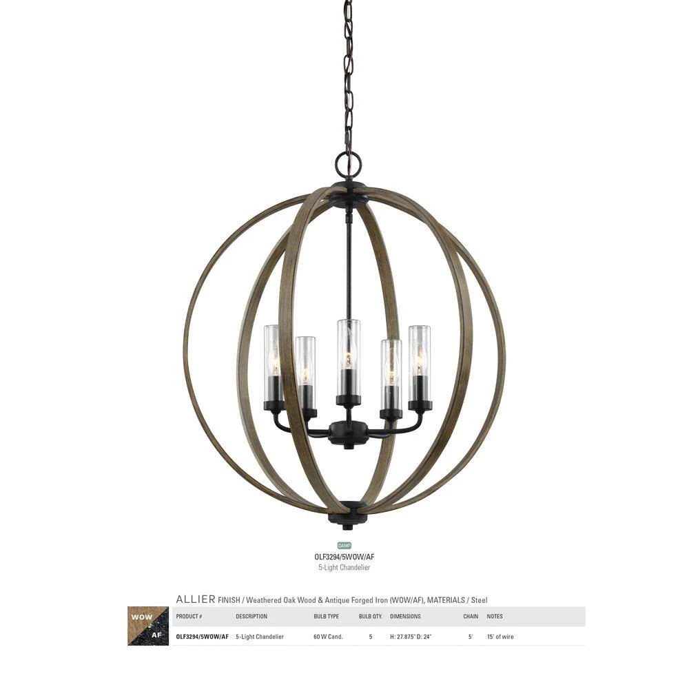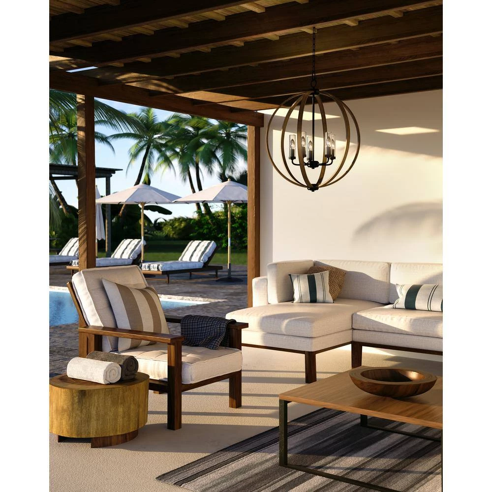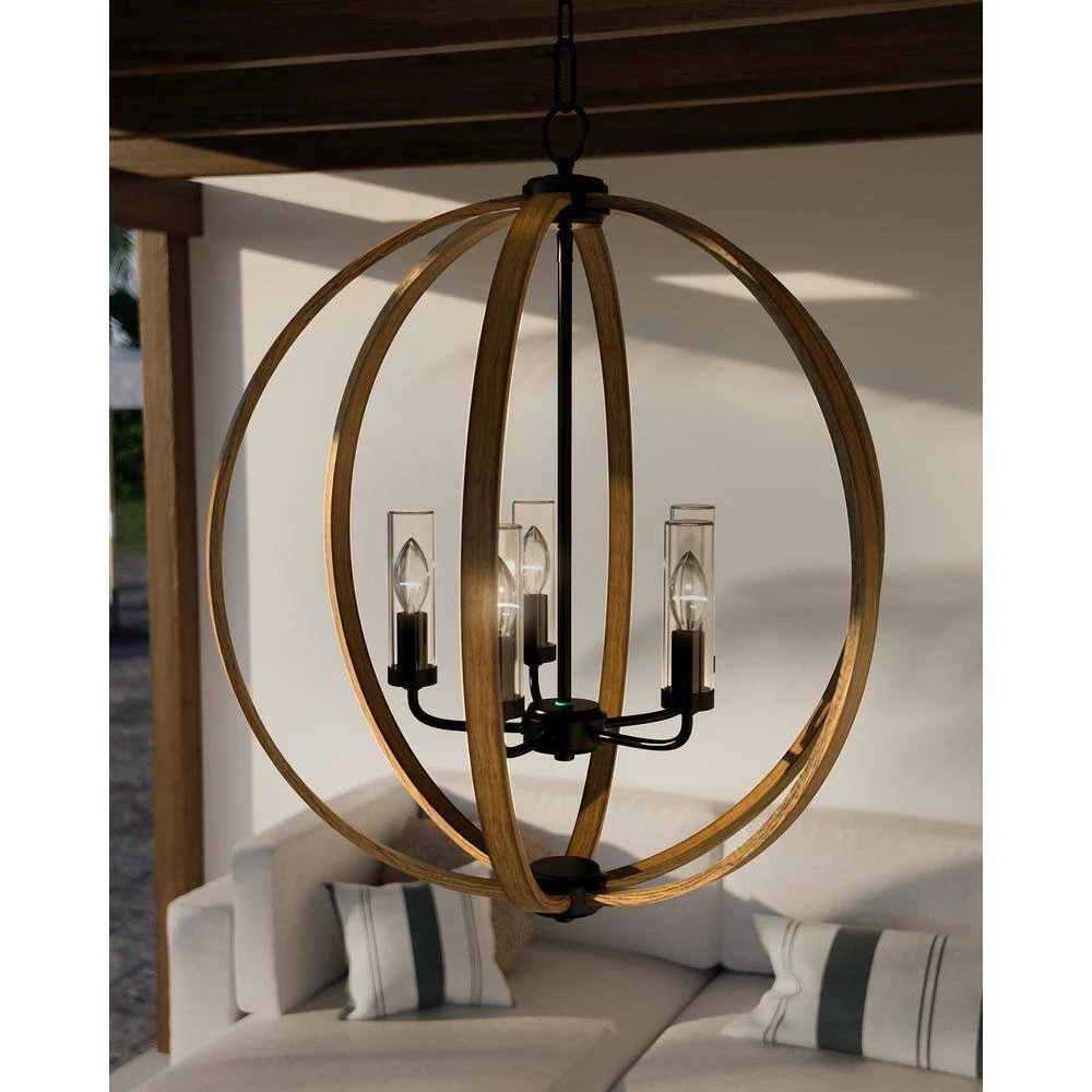 The Allier Outdoor chandelier makes an elegantly rustic statement by blending warm wood tones with Antique Forged Iron hardware on a modern orb silhouette. We’ve taken the top product from this best-selling Collection and are now offering a Damp-Rated version that can be used indoors as well as covered outdoor spaces. Perfect for a Farmhouse Chic aesthetic.