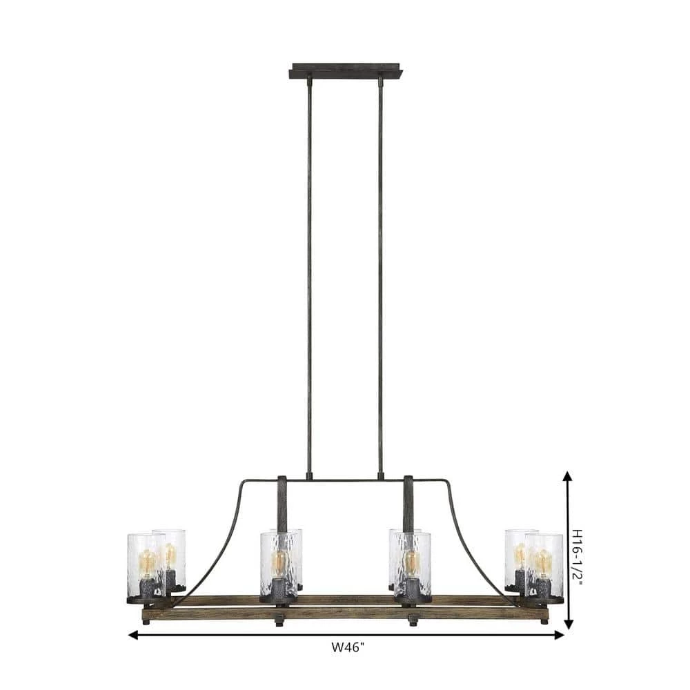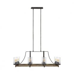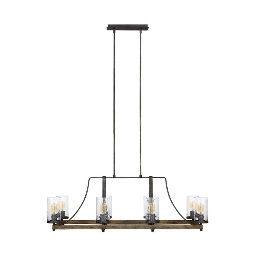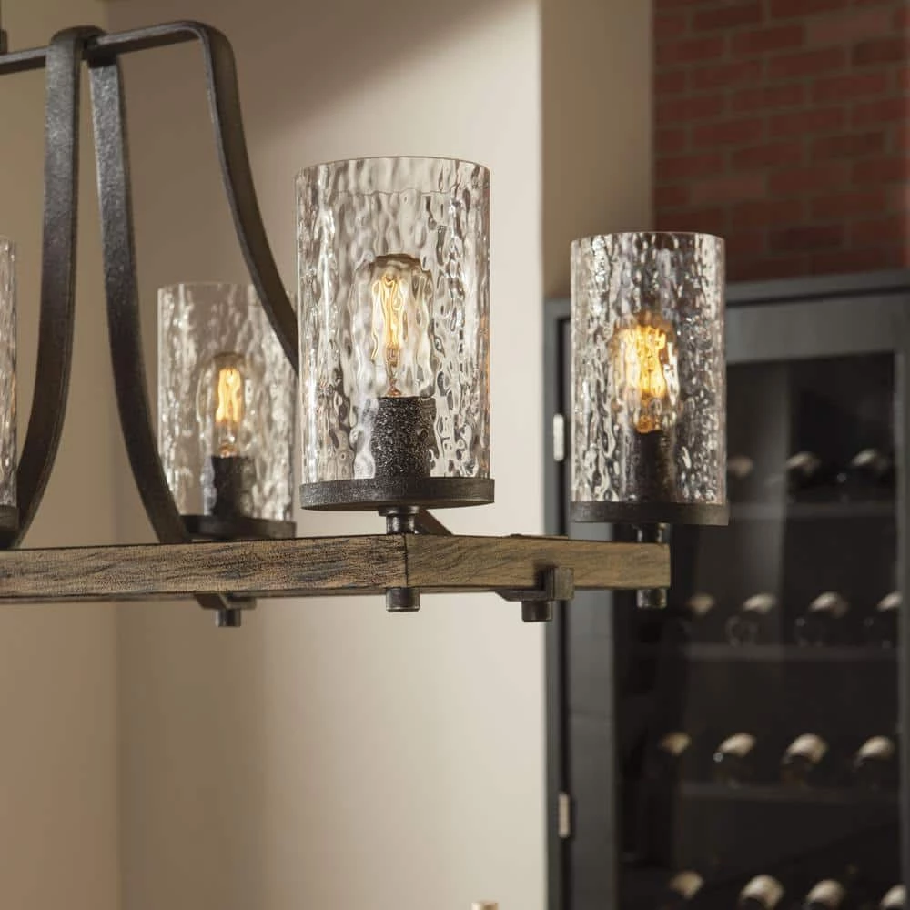 Influenced by both rustic and industrial design, the transitional Angelo chandelier collection by Feiss celebrates the beauty of imperfection and the visual impact of mixed materials to create an overall rugged look. The cylindrical Clear Thick Wavy glass shades complement the 2-toned finish of Distressed Weathered Oak on the outer structures and a new pitted, richly textured Slated Grey Metal finish on the sloping arms for a rustic but tailored look. Perfect as foyer lighting, living room lighting or paired over a dining room table and the largest fixture will be the crowning touch to any great room.