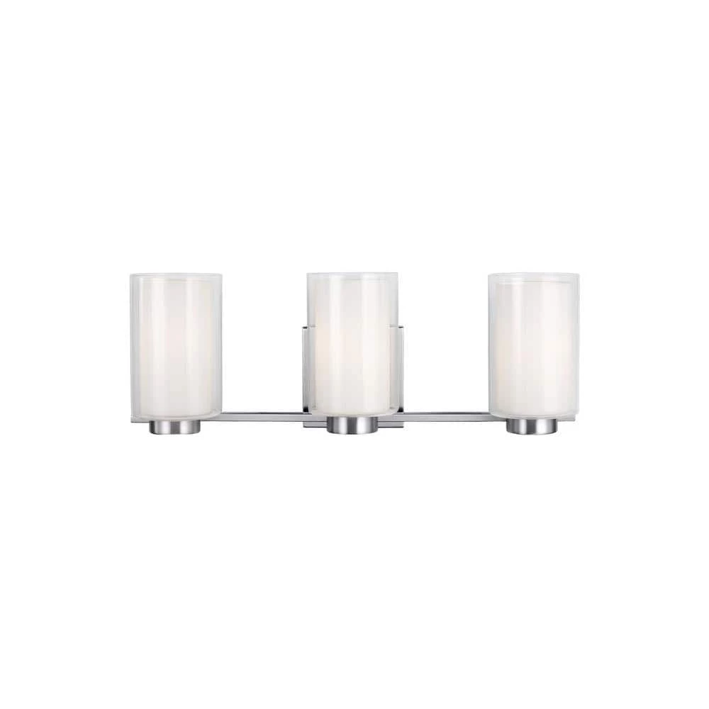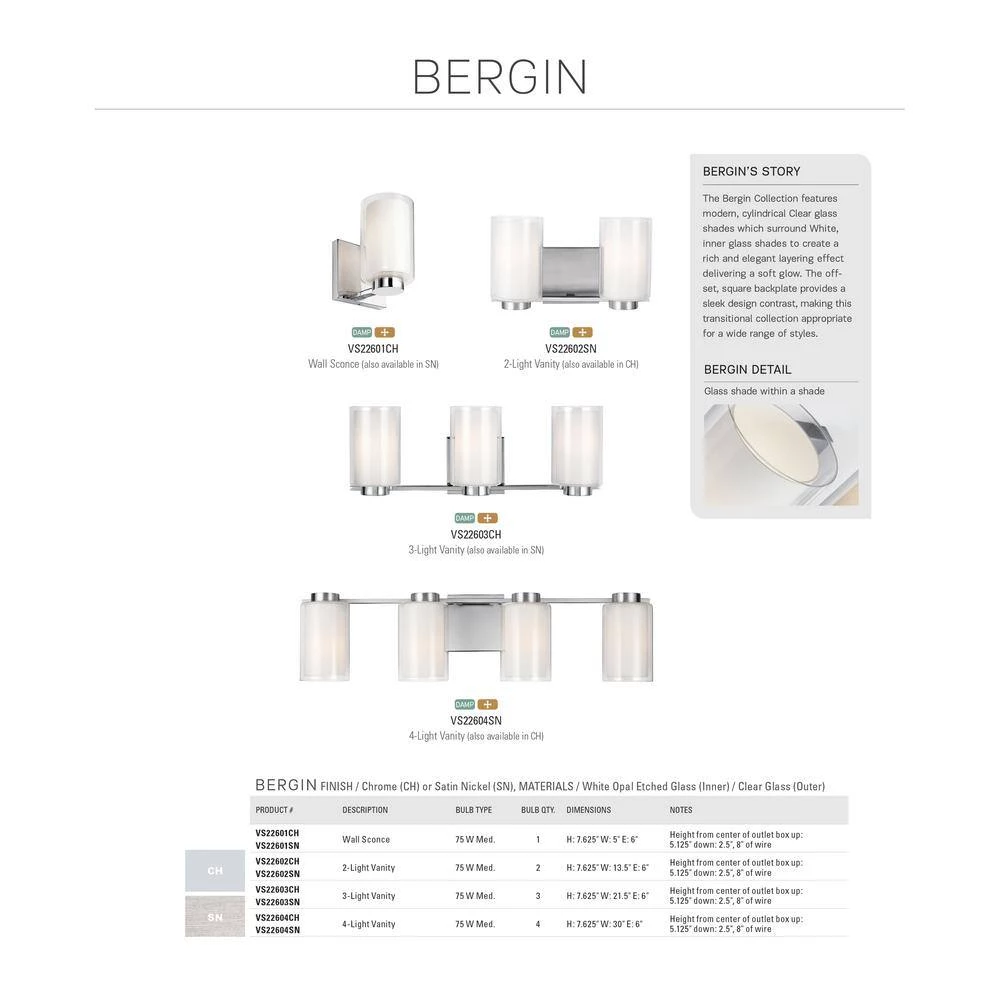 The Feiss Bergin 3-light vanity fixture in satin nickel offers shadow-free lighting in your powder room, spa, or master bath room. The Bergin bath lighting collection by Feiss features modern, cylindrical Clear glass shades which surround White, inner glass shades to create a rich and elegant layering effect delivering a soft glow. The off-set, square backplate provides a sleek design contrast, making this transitional collection appropriate for a wide range of decor. Available in either a Satin Nickel or Chrome finish, Bergin can be mounted up or down. Lighting fixtures in the line include 2-, 3- and 4-light bath vanities and a 1-light wall sconce.