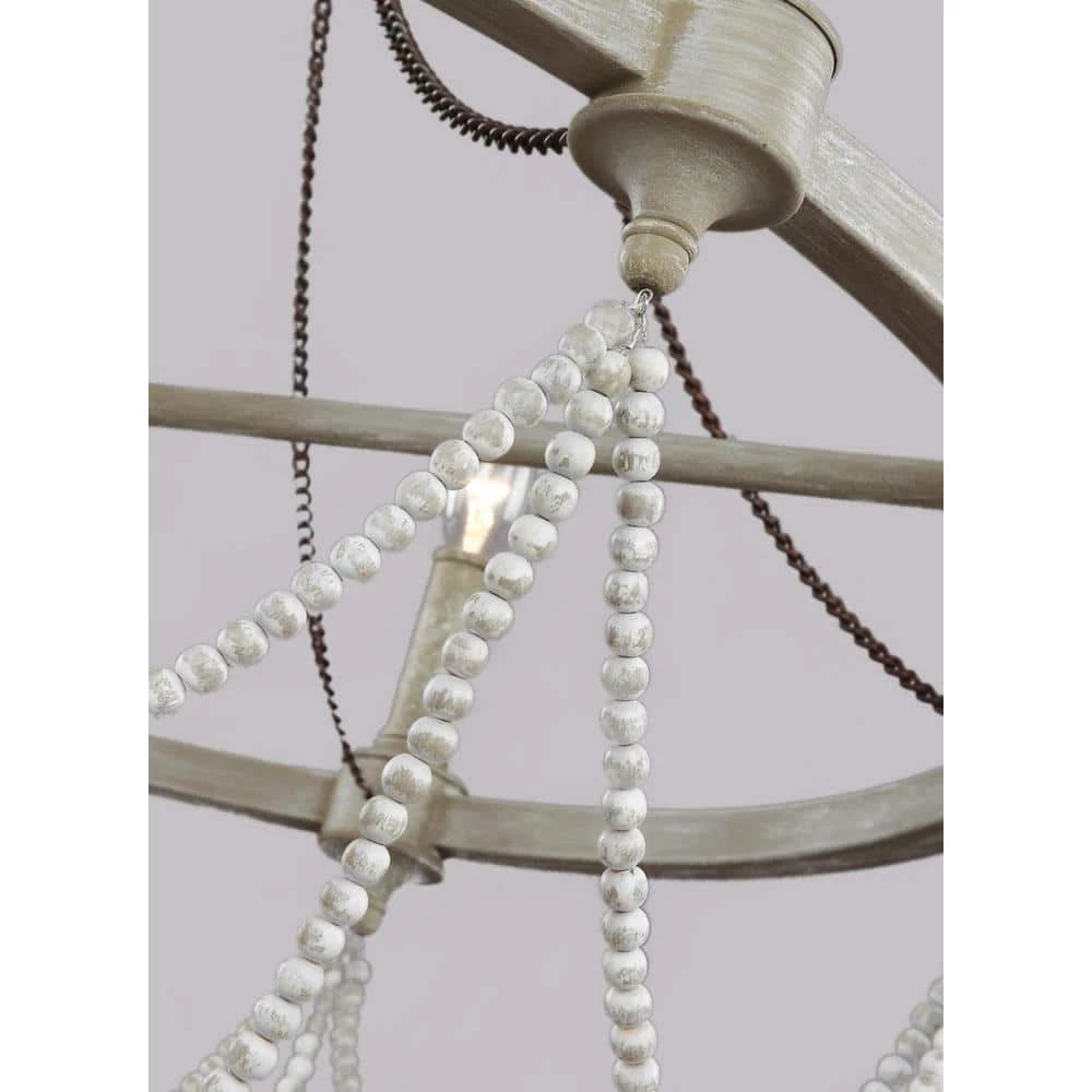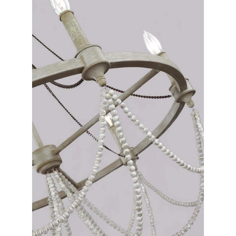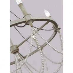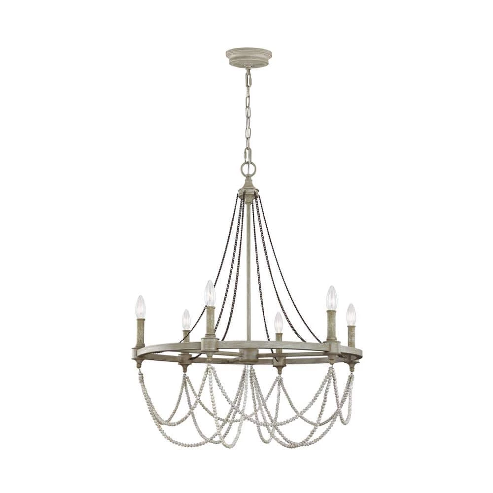 The Beverly 6-light chandelier by Feiss features the perfect balance of rustic, time-worn finishes like a new Distressed White Wood beads, Natural Rock Crystal beads, the new vintage-inspired French Washed Oak finish on the frame and candle tubes and the Weathered Iron finish on the chain. Together these elements create a warm and elegantly simple update to the traditional style of this classic light fixture. The simple silhouette of these light fixtures makes them versatile to fit in a wide range of decor and the rustic finish makes them particularly ideal for living rooms, dining rooms and bedrooms with casual, traditional decor, European farmhouse design or the shabby chic look.