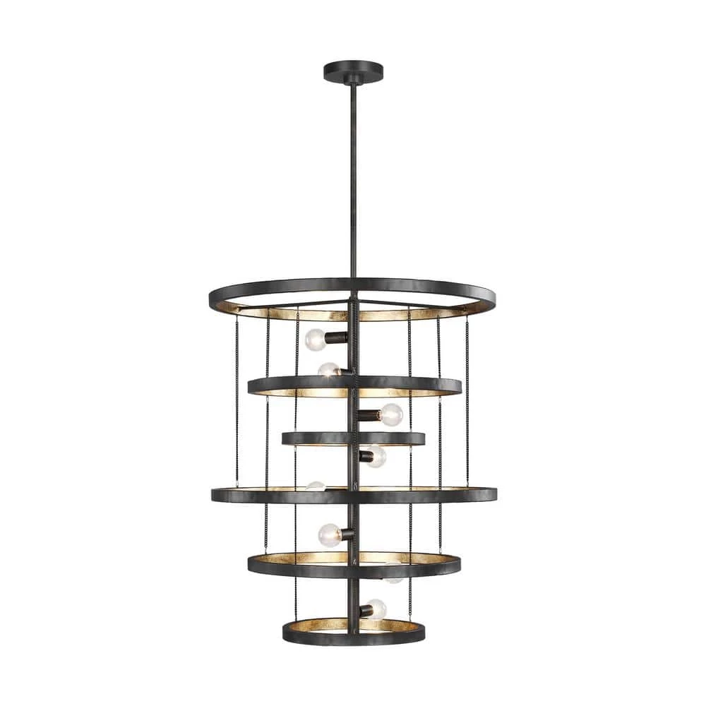 The Feiss Celeste 8 light multi-tier chandelier in Aged Iron enhances the beauty of your home with ample light and style to match today’s trends. Celeste offers smooth sculptured rings suspended by chain while the bulbs are affixed on the inner rod offering a modern rustic appeal, with playful movement. Aged Iron and gold leaf finish. Available in 2 sizes.