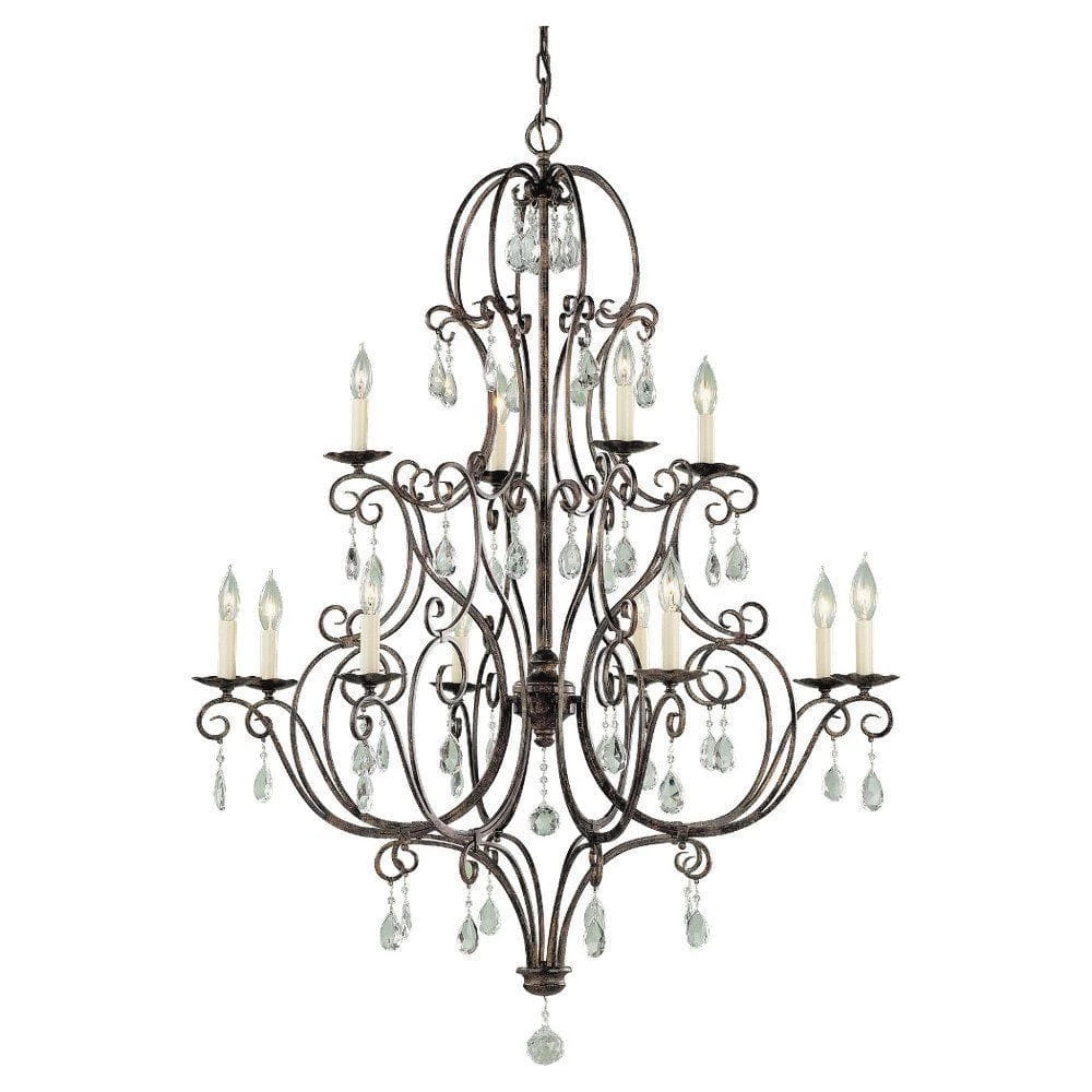The Feiss Chateau twelve light multi-tier chandelier in mocha bronze provides abundant light to your home, while adding style and interest. Inspired by the grand Chateaus of Southern France, this collection is both delicate and detailed. Its square tube curls lyrically play into one another as the hand polished glass crystals punctuate each curl.