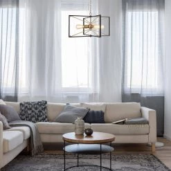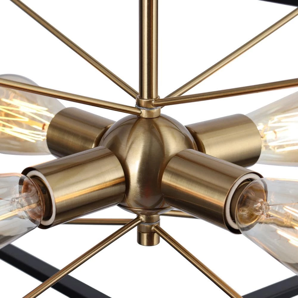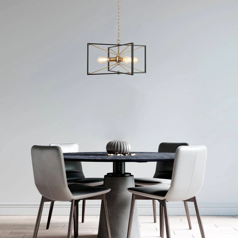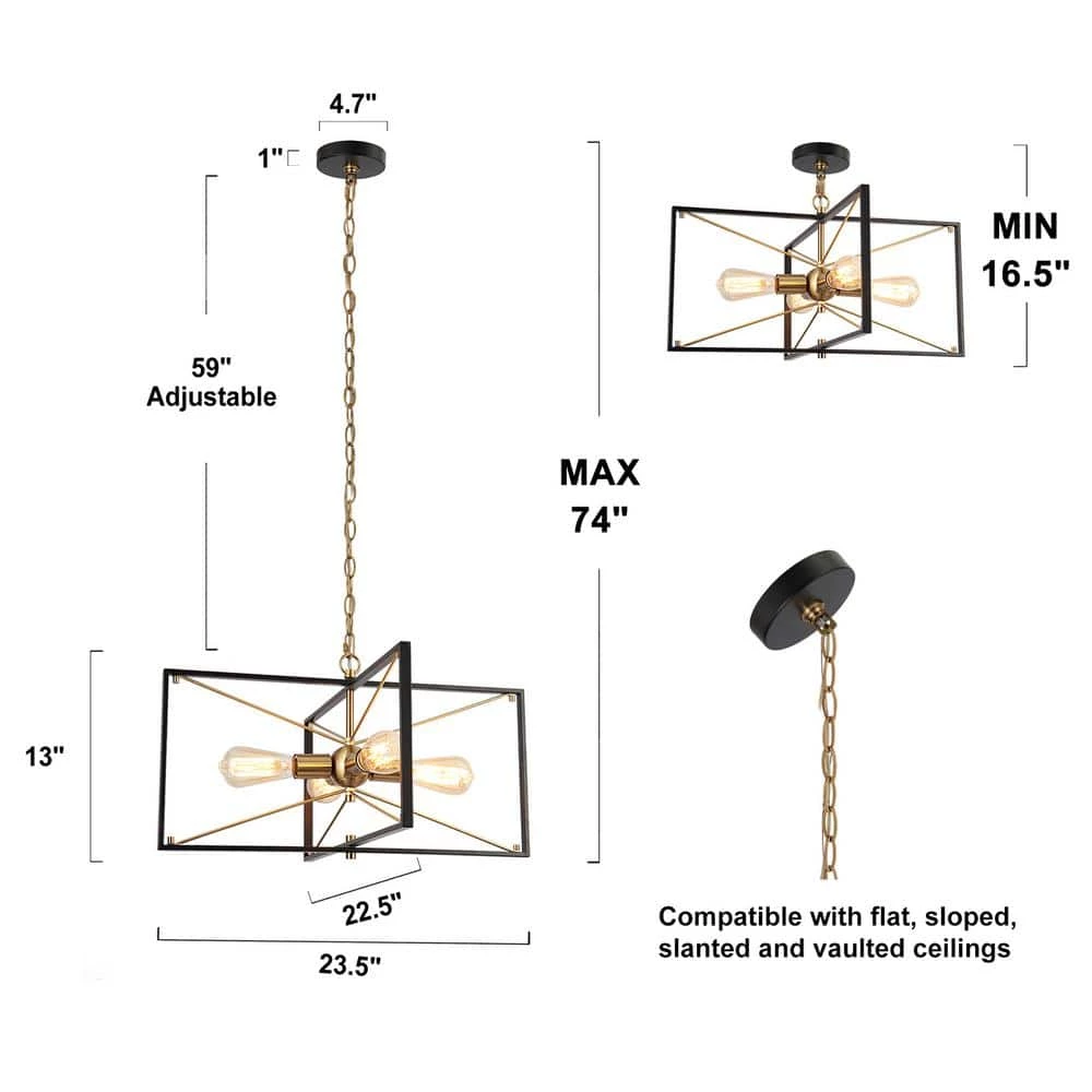 The fabulous combination of black and sparkling brass gold brings mystery and high-fashion feelings to your house decoration. Slender metal bars interlace to form square/rectangular frames, forming a unique geometric lamp body, ideal for any modern industrial and transitional style. Without glass shades, the exposed bulbs (not included) will provide very bright lighting and are easy to replace. With a widely adjustable gold hanging chain, the geometric modern chandelier allows you to install it as a stylish hanging light or a semi-flush mount ceiling light, perfect for your bedroom, kitchen island, living room, hallway, and dining room.