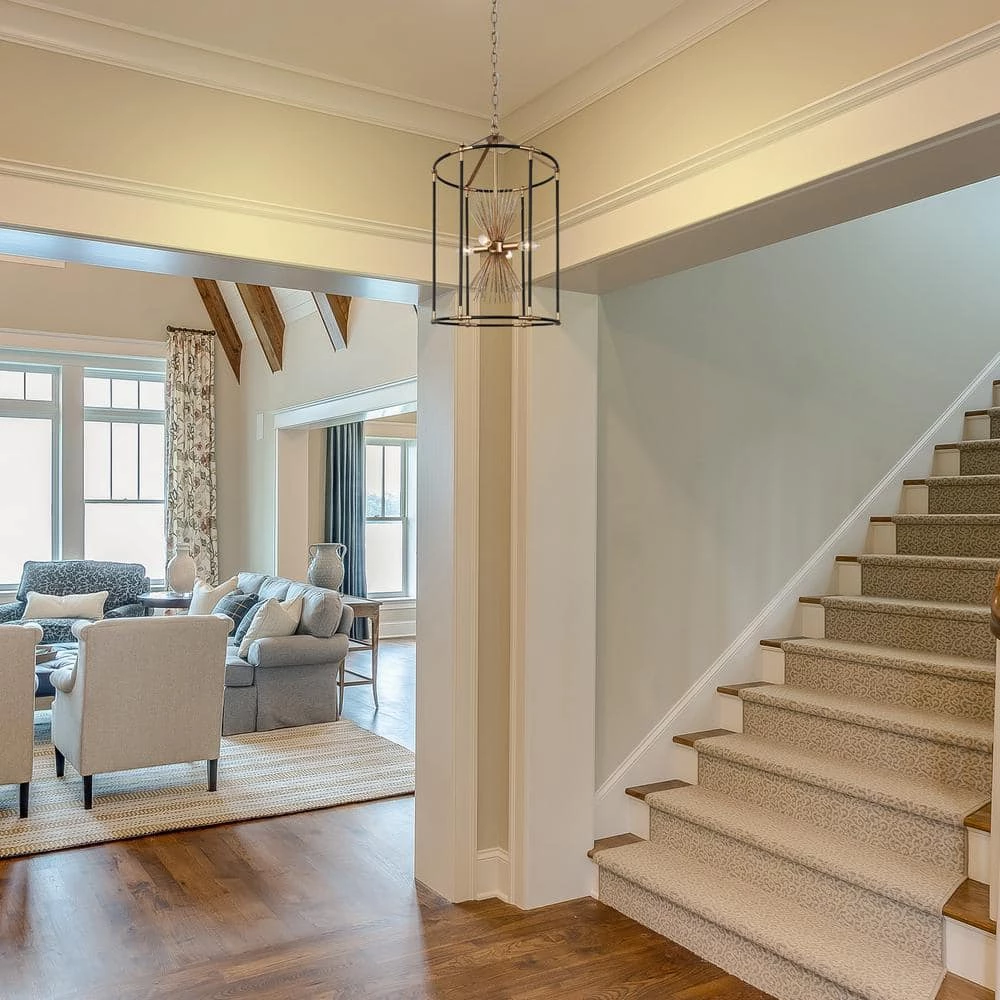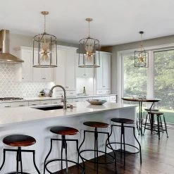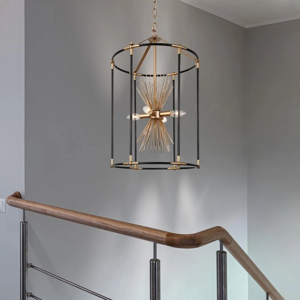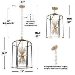 Featuring a unique birdcage shape and starburst design inside, this black pendant hanging light is a fabulous choice to complement any modern or transitional house decoration. The combination of black and dark gold presents a hint of mystery while the slender metal bars which make up the open cage frame bring a sense of modern simplicity and cottage flair. With a widely adjustable hanging chain, this modern industrial 4-light chandelier lighting can be installed at a suitable length on both flat and sloped ceilings, providing ample brightness for your kitchen island, dining room, entryway, hallway, living room and any other suitable place.