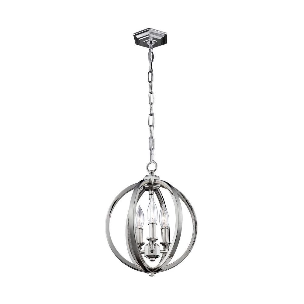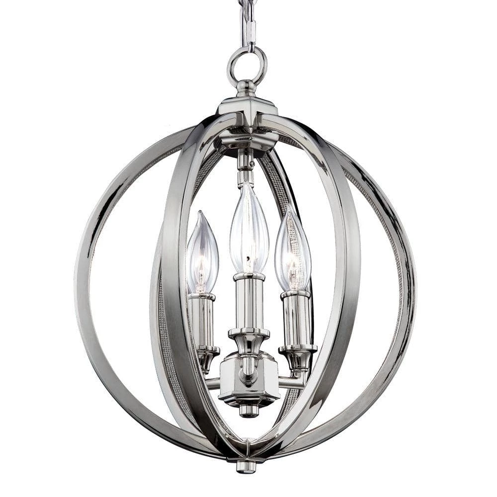 The modern orb silhouette of the Corinne pendant light collection by Feiss is interpreted in two distinct ways. In Polished Nickel, it features an Inlay Crystal detail along the inner surfaces for dramatic sparkle. The center candles are attached by a hub giving the illusion they’re floating. The three main hubs and ceiling canopy all share the same architectural styling details.