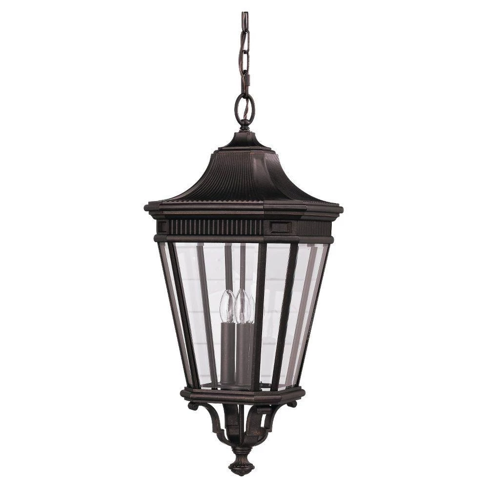 The Feiss Lighting Cotswold Lane 3-light outdoor pendant fixture in Grecian bronze enhances the beauty of your property, makes your home safer and more secure, and increases the number of pleasurable hours you spend outdoors. This Cotswold Lane outdoor pendant combines function and style. This exterior light fixture is a great choice for a do-it-yourself project.