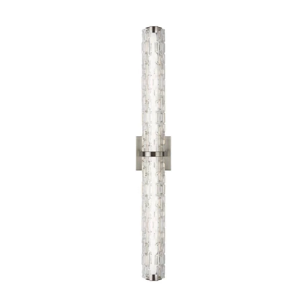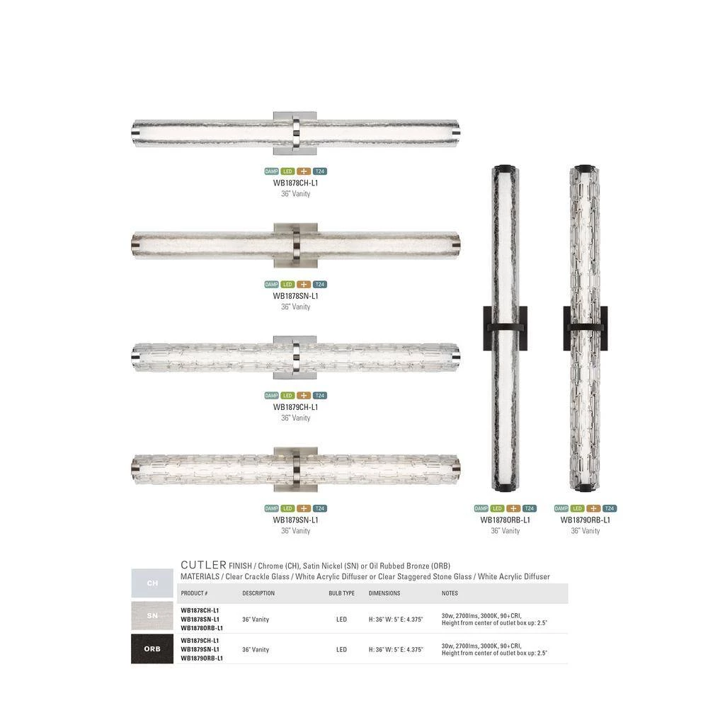 The sleek linear profile of the Cutler Collection creates a perfect, contemporary backdrop for two unique glass options. Tiles of either Clear Crackle glass or Clear Staggered Rock glass are set in an organic version of a subway tile look and allow the LED light to shine through, adding rich sparkle to the room. Fixtures have a CCT of 3000K.