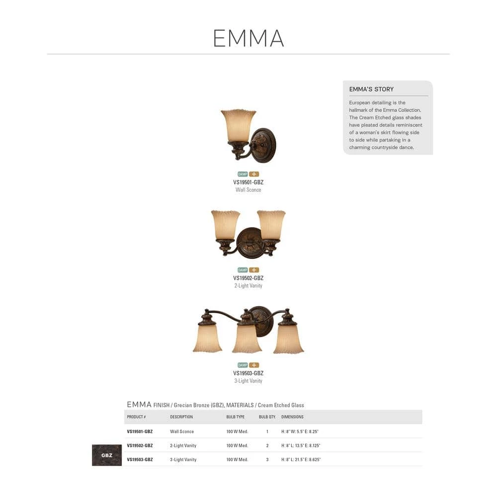 European detailing is the hallmark of the Emma bath lighting collection by Feiss. The Cream Etched glass shades have pleated details reminiscent of a woman’s skirt flowing side to side while partaking in a charming countryside dance. The Feiss Lighting Emma 3-light vanity fixture in Grecian bronze provides abundant light for your bath vanity, while adding a layer of today’s style to your interior design.