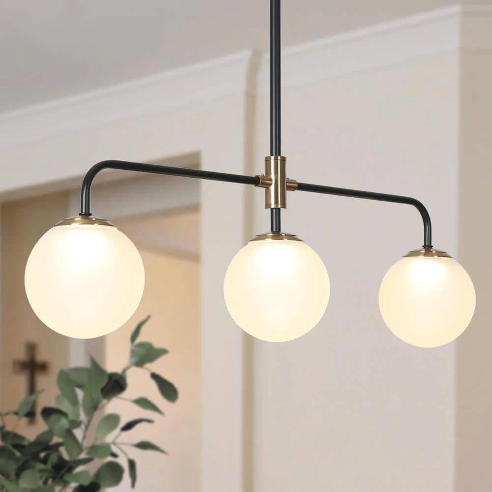 Use this modern brass gold and black 3 lights chandelier to enhance your dining room or kitchen island. The white Frosted glass provided a hazy feeling and creates a warm atmosphere. With LED lighting, you will save a lot of budget on electronics, truly energy-saving and efficient.