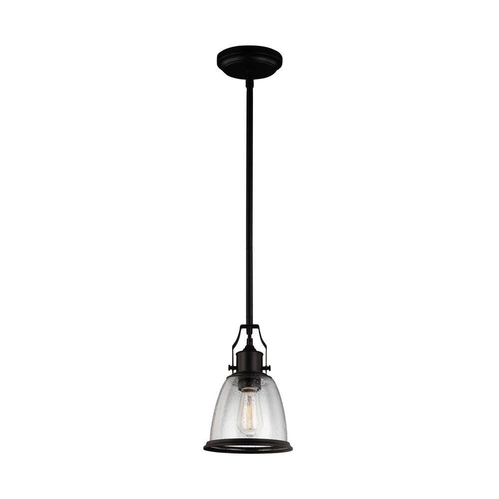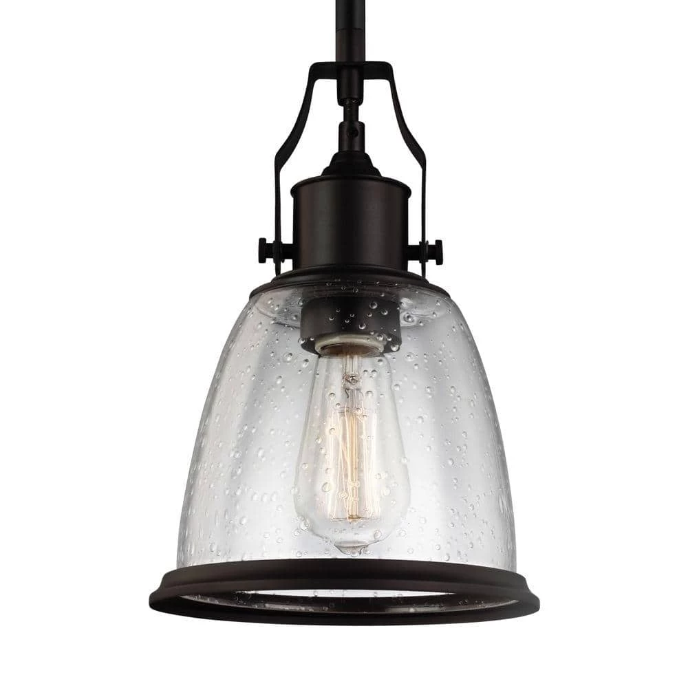 The Feiss Hobson 1-light mini pendant in oil rubbed bronze is the perfect way to achieve your desired fashion or functional needs in your home. The Hobson lighting collection by Feiss brings the industrial-inspired pendant to a whole new level of modern detail and technology. The top pivot adds authenticity, and the large selection of shades, including 3 metal finishes of Aged Brass, Oil Rubbed Bronze or Satin Nickel or 2 glass options of Opal Etched Case or Clear Seeded glass, meets any design objective. The pendants have 4 lamping options traditional or Antique-style incandescent, fluorescent or LED. The assortment includes a 1-light mini-pendant, medium and large 1-light pendants, a 3-light Island pendant and a 3-light chandelier. The fixtures have 4 lamping options traditional or Antique-style (for clear glass options) incandescent, fluorescent or LED.