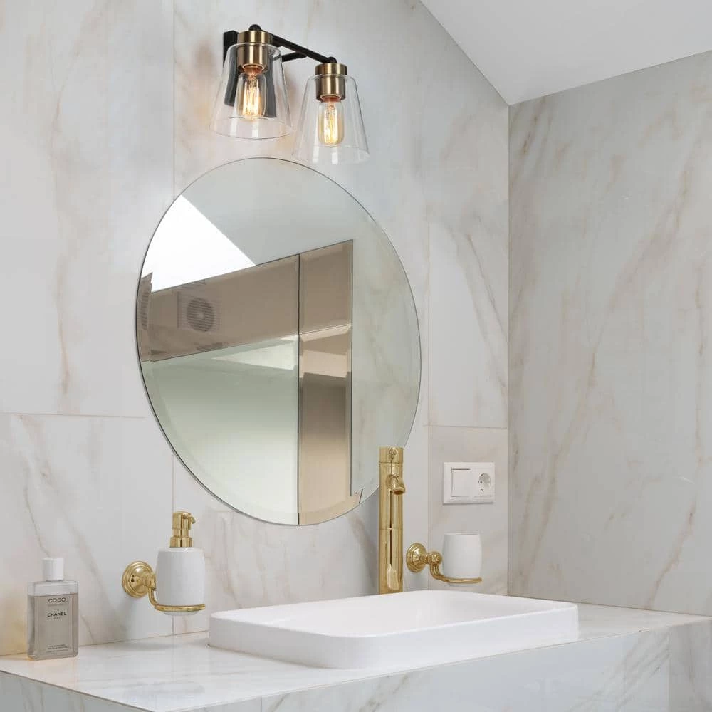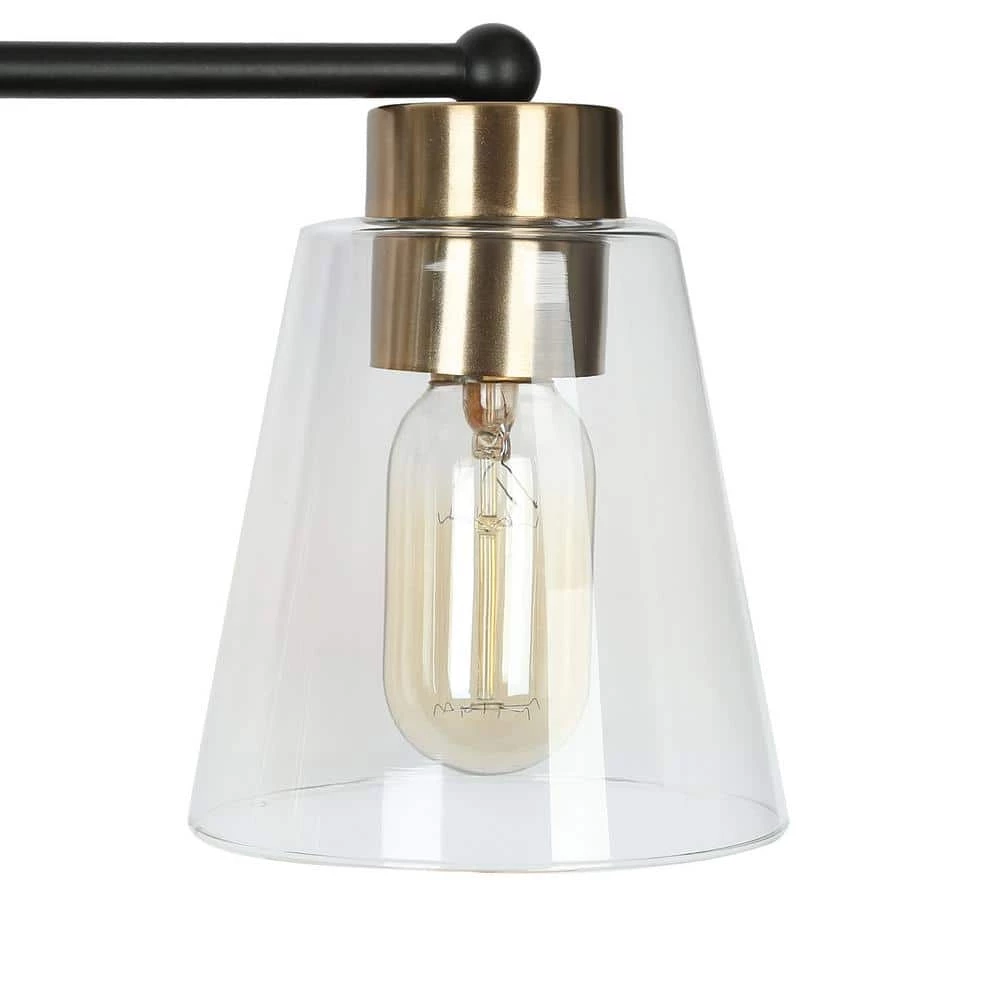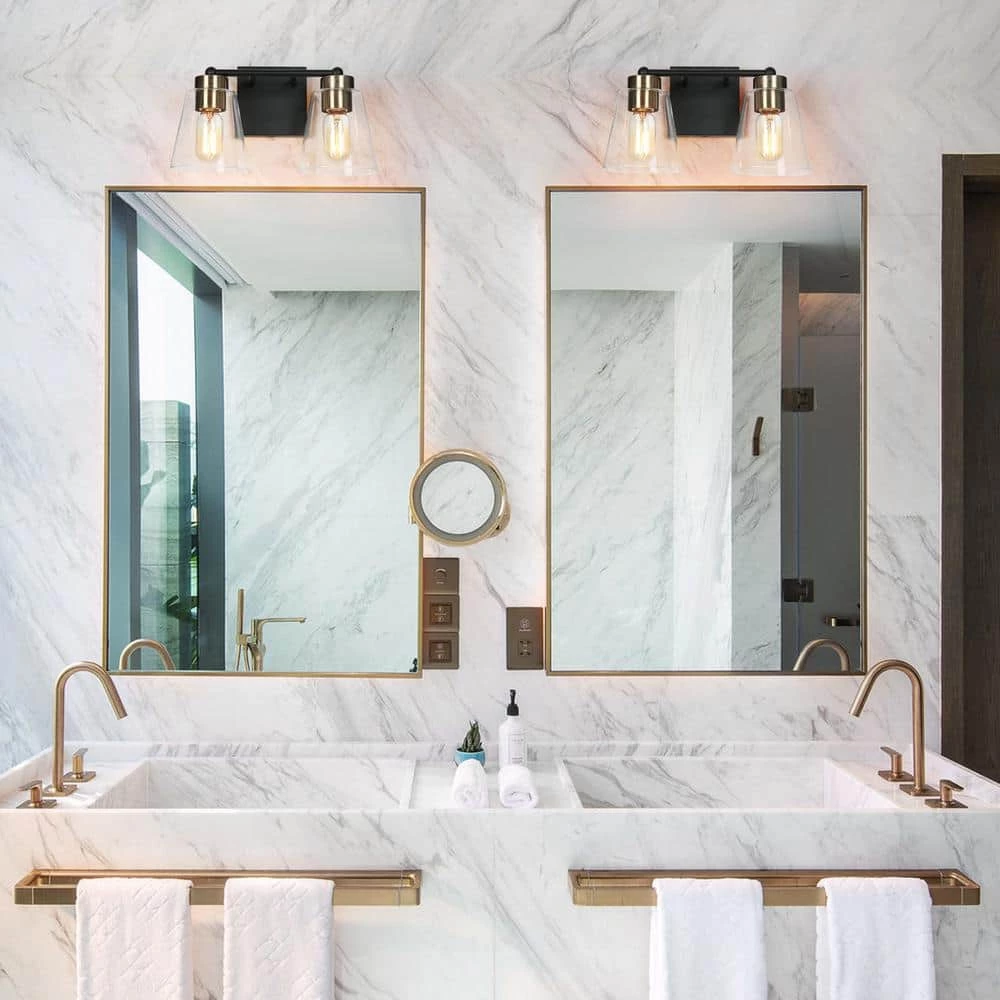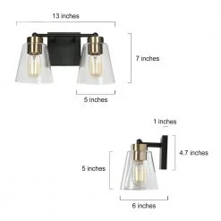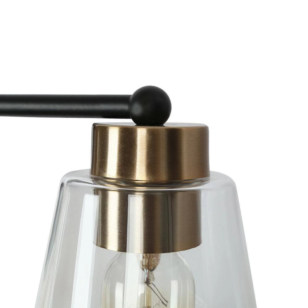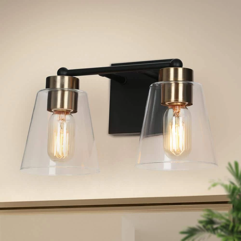 A shiny yet vintage look brings new modernity to your home decoration. This black indoor wall sconce will complement any house style well. with a highly polished brass and vintage black finish, the 2-light vanity light blends modern, industrial and classic elements, working as both functional and decorative lighting fixtures to highlight your bathroom, powder room, hallway, entryway, staircase and pair with mirrors or artworks. The slender black metal bar and bright gold lamp holders with cone clear glass shades present a simple and understated delicacy.