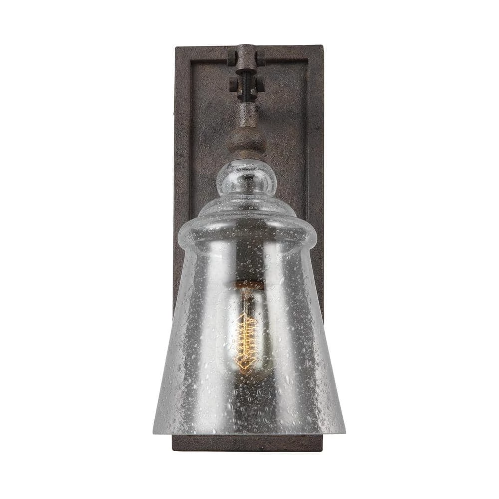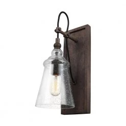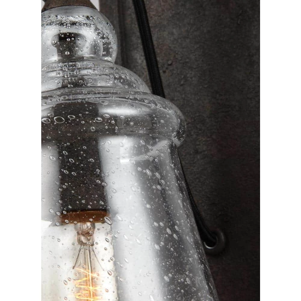 The Feiss Loras 1-light wall sconce in dark weathered iron offers shadow-free lighting in your powder room, spa, or master bath room. Contemporary take on historic, industrial designs, these transitional chandeliers feature multiple corded pendants with Clear Seeded glass shades for rustic charm. Easily made more energy efficient with a LED Candelabra replacement bulbs (purchased separately).
