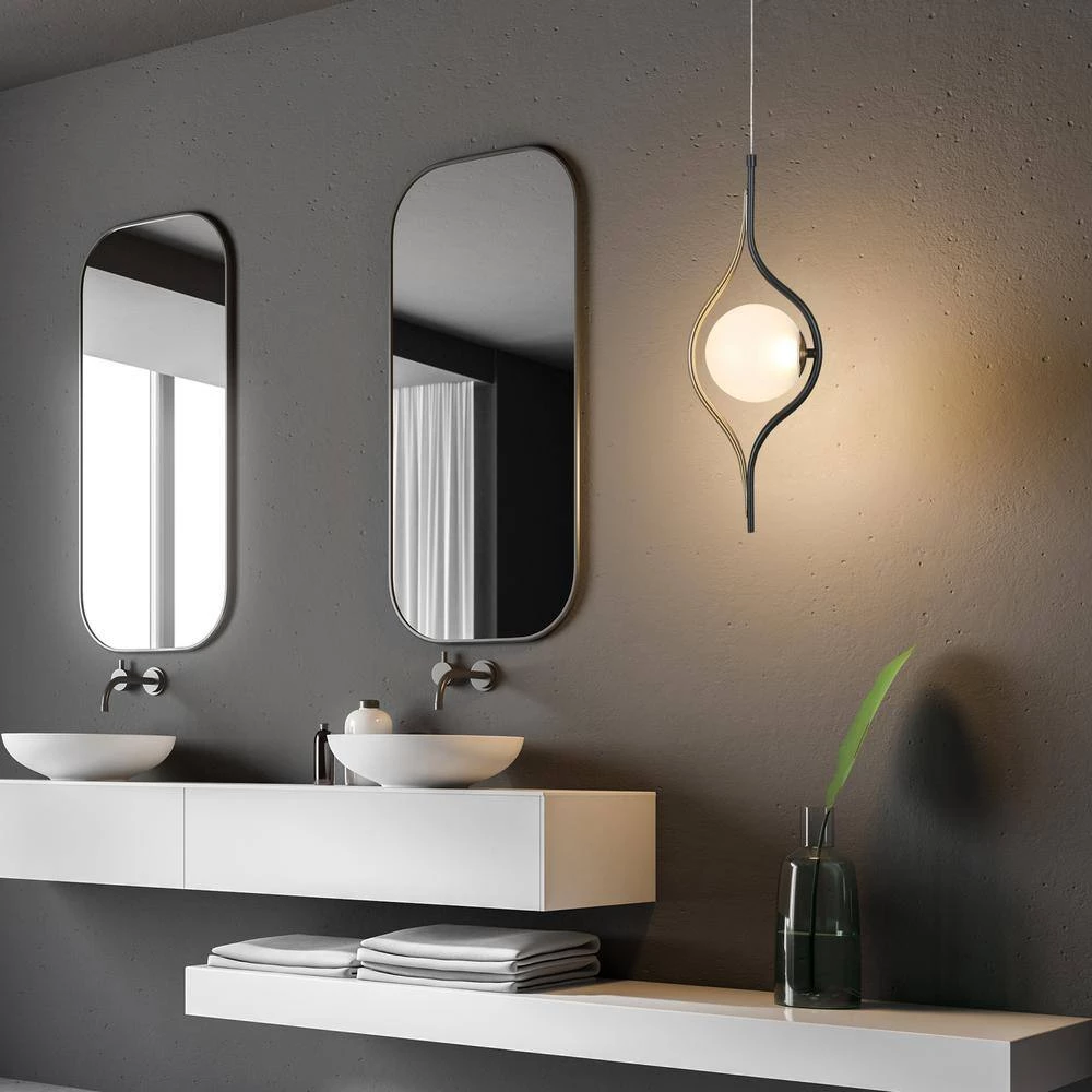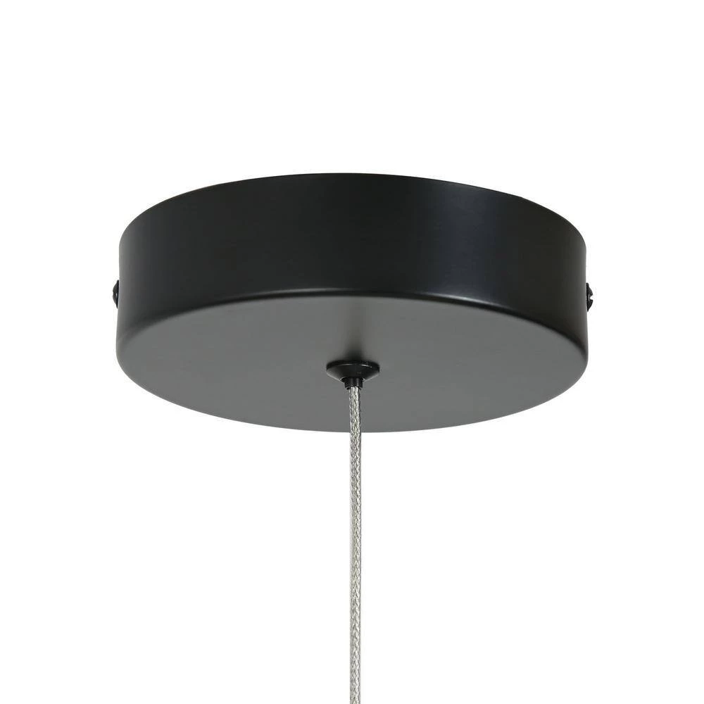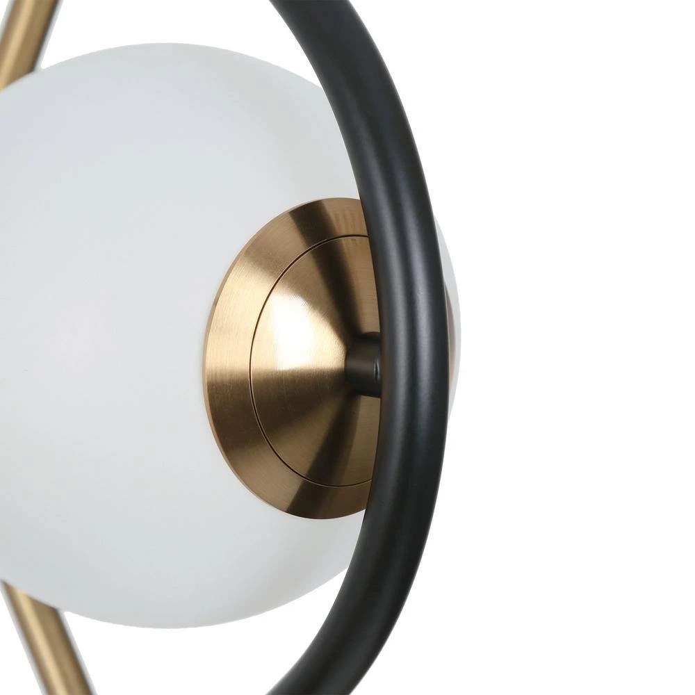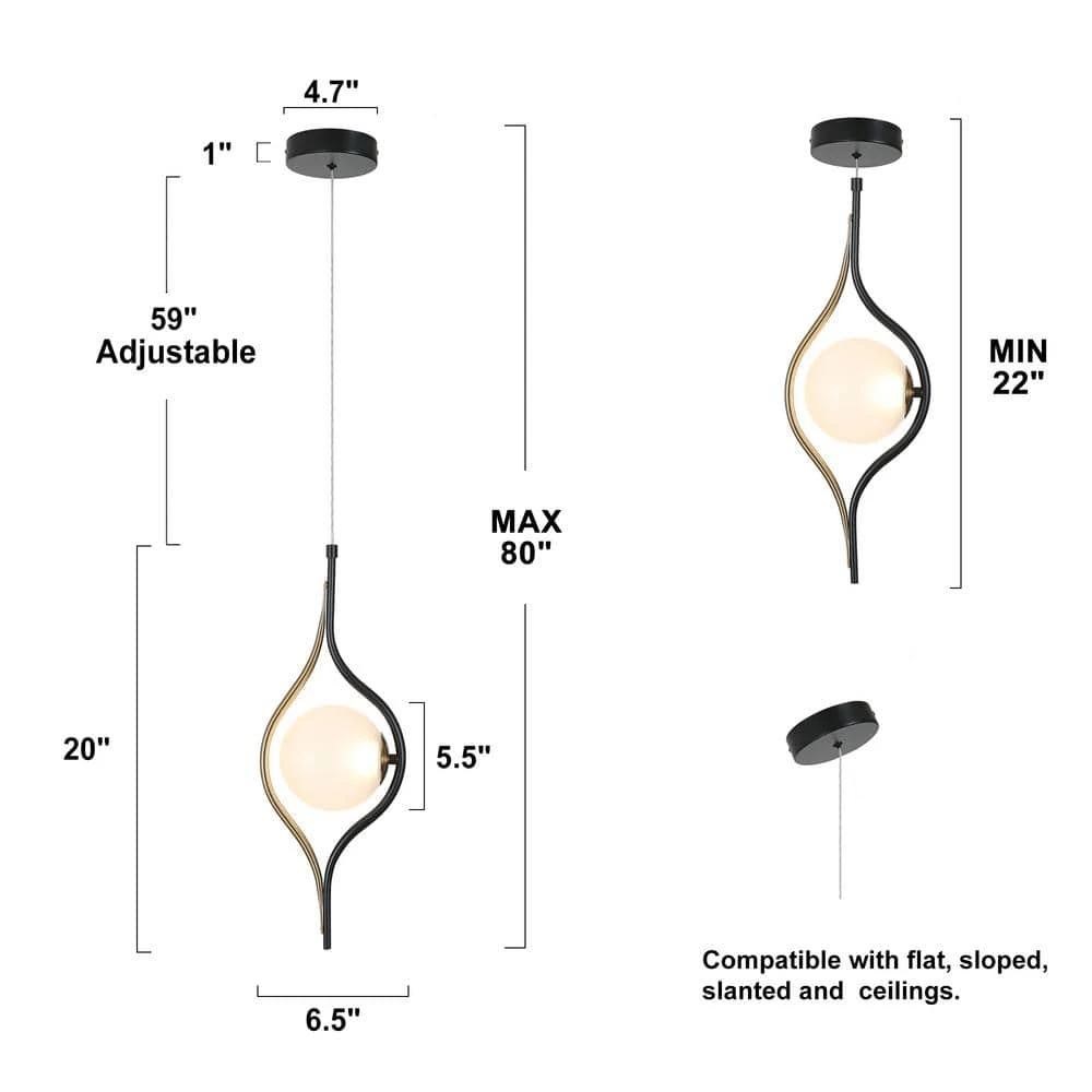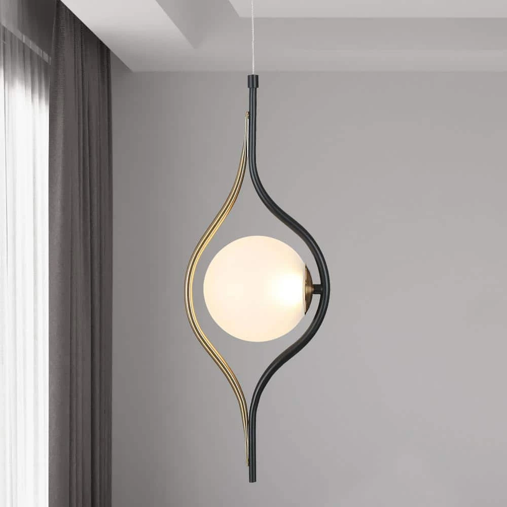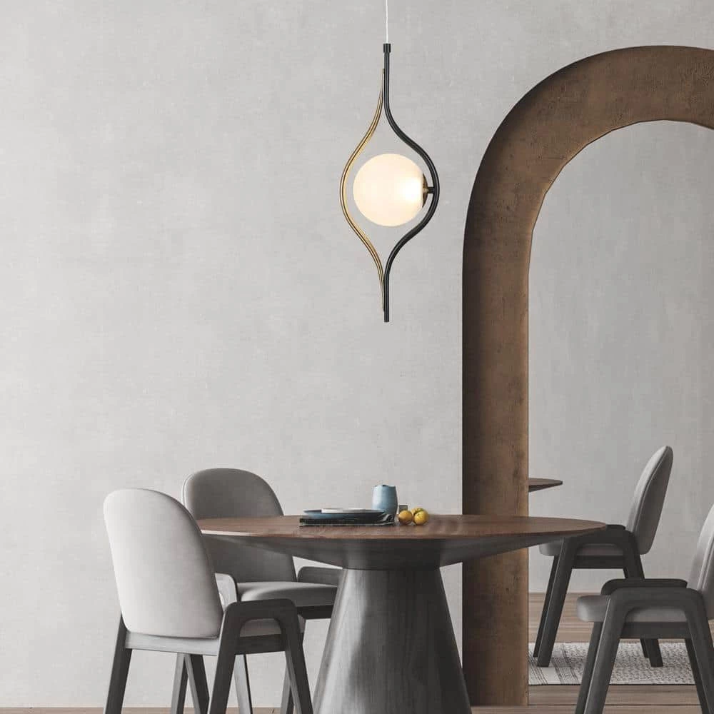 This modern eye-like pendant lamp is made of plated brass and matte black with a frosted glass globe. The lampshade made of frosted glass ideally diffuses the light. Durable and long-lasting Integrated LED lights saves your energy and time and offers desired warm light for your space.