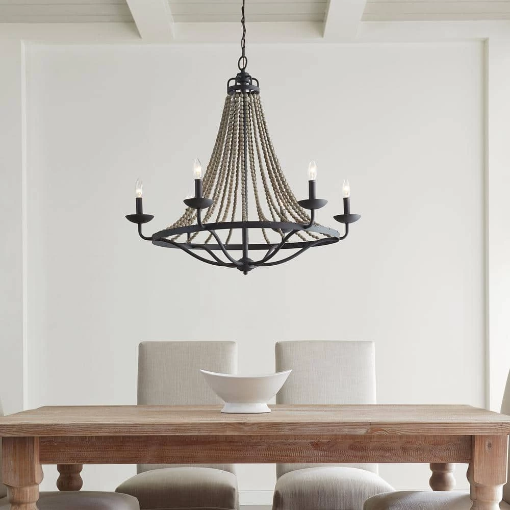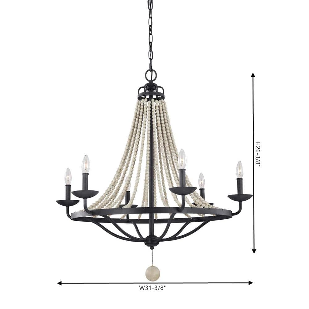 - Large scale, elegantly simple, traditional chandelier updated with rustic touches of driftwood grey wood beads and weathered zinc finish