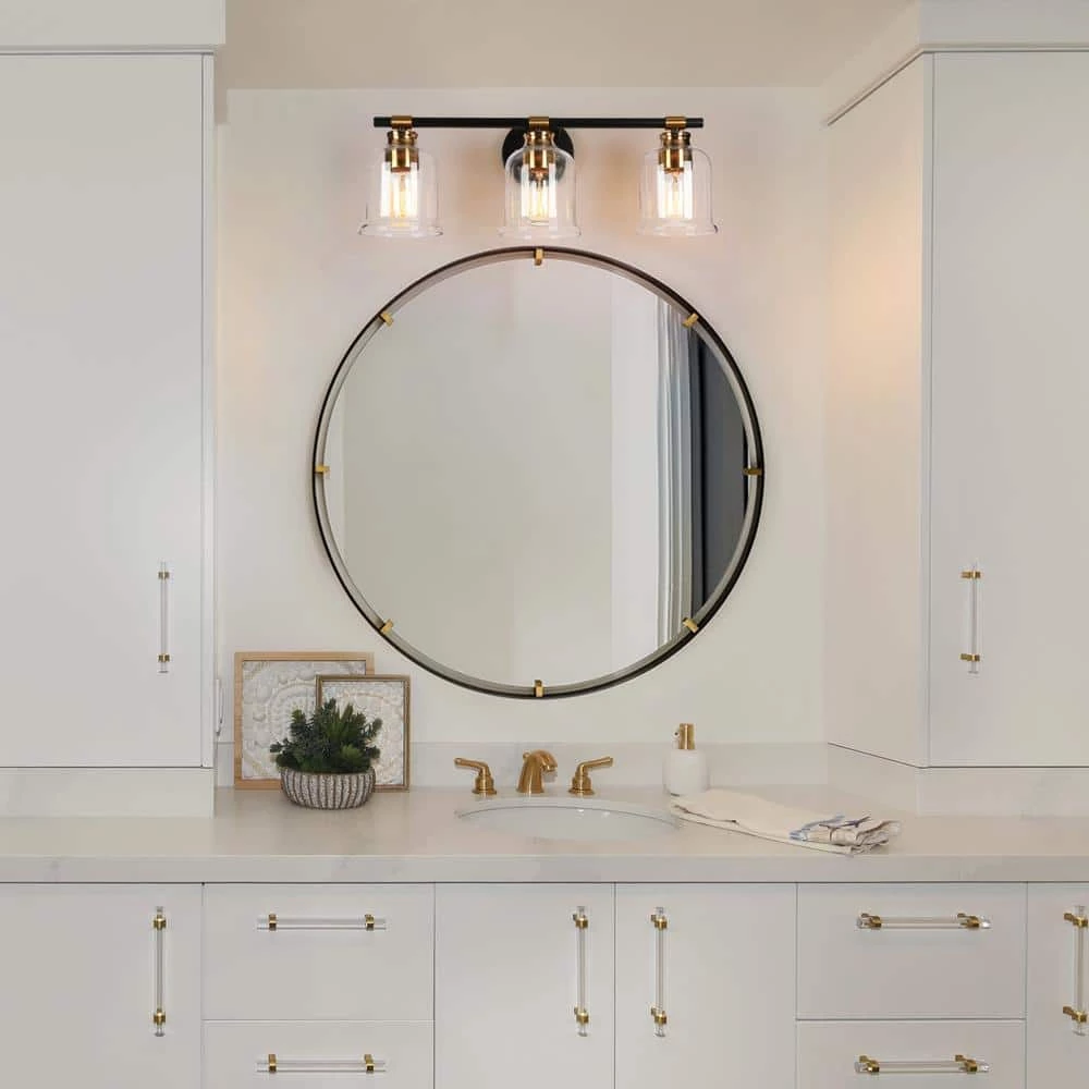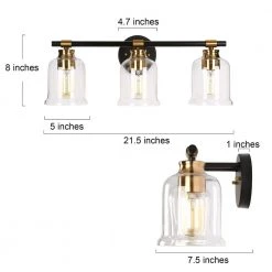 A sophisticated and stylish lighting fixture to update your bathroom. With a bright gold finish, simple black metal lamp body, and vintage-inspired bell design, this 3-light transitional modern vanity light is a fabulous choice to complement any of your space. The smooth and shiny texture will light up your house and make your space brighter and more dynamic. The black linear metal bar with classic bell-shaped glass shades also presents an industrial flair, bringing you minimalist visual enjoyment. The bottom-opening cylinder shades are designed for ample bright light and also can be mounted up or down in the bathroom, powder room, and any other place.