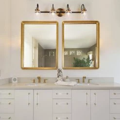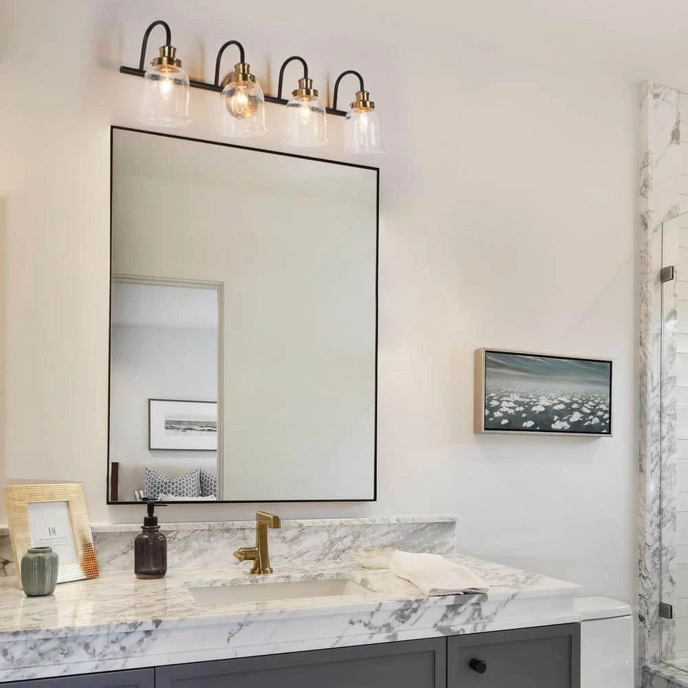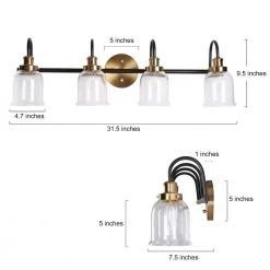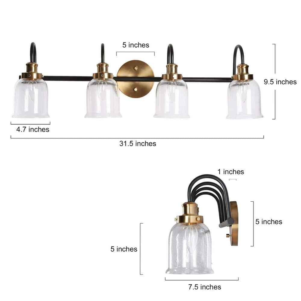 This Classic Black Wall Lighting Fixtures, 31.5 in. 4-Light Brass Vanity Light for Bathroom with Bell Seeded Glass Shades combines both traditional and modern elements, bringing a sense of modern texture as well as retro flavor to your home decoration. The timeless black finish perfectly pairs with any existing furniture, while the sparking plating brass will make the modern vanity light a highlight in your space. with clear seeded glass shades, this 4-light transitional vanity light is very suitable for your bathroom or powder room to collocate with mirrors, emitting clear bright lighting.