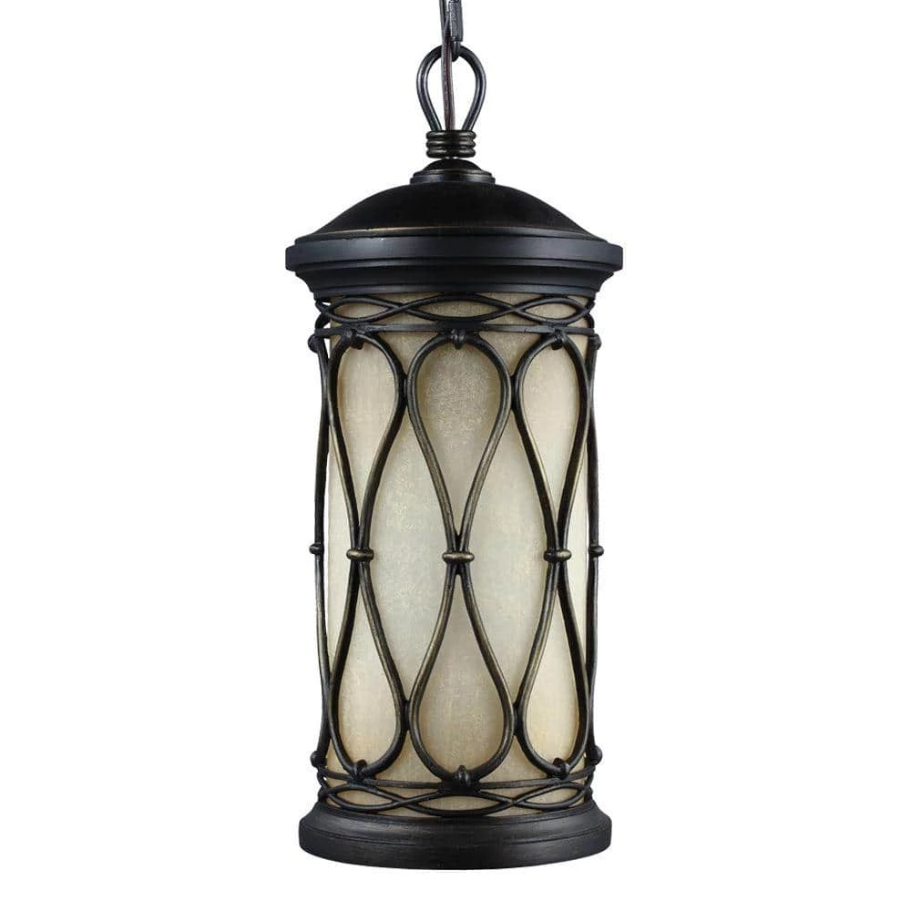 The Feiss Wellfleet 1-light outdoor pendant fixture in aged bronze enhances the beauty of your property, makes your home safer and more secure, and increases the number of pleasurable hours you spend outdoors. The traditional Wellfleet outdoor lighting collection by Feiss features a classic ribbon detail known as an infinity motif which nicely complements the cylindrical lantern silhouette. The Amber glass shade obscures the lamping, nicely diffuses the light and hides any dirt. Made of a proprietary composition, the fixture has exceptional durability to withstand the harshest elements and a 5-year warranty. In an Aged Bronze finish, the collection includes small, medium and large 1-Light Outdoor Wall Lanterns, 1-Light Outdoor Post, 1-Light Outdoor Hanging Lantern and a 2-Light Outdoor Flush mount. Incandescent, Fluorescent and LED lamping options are available.