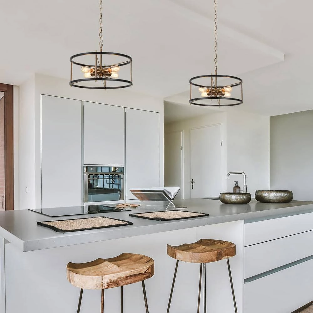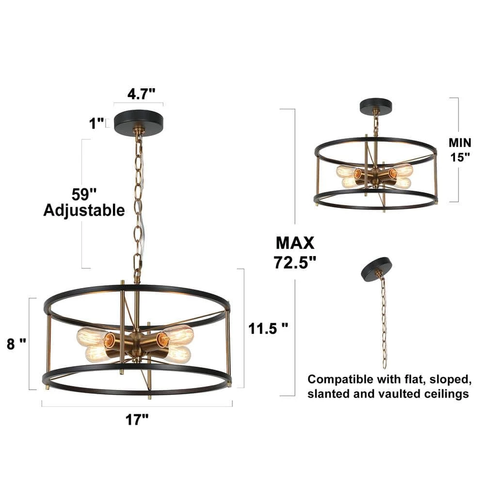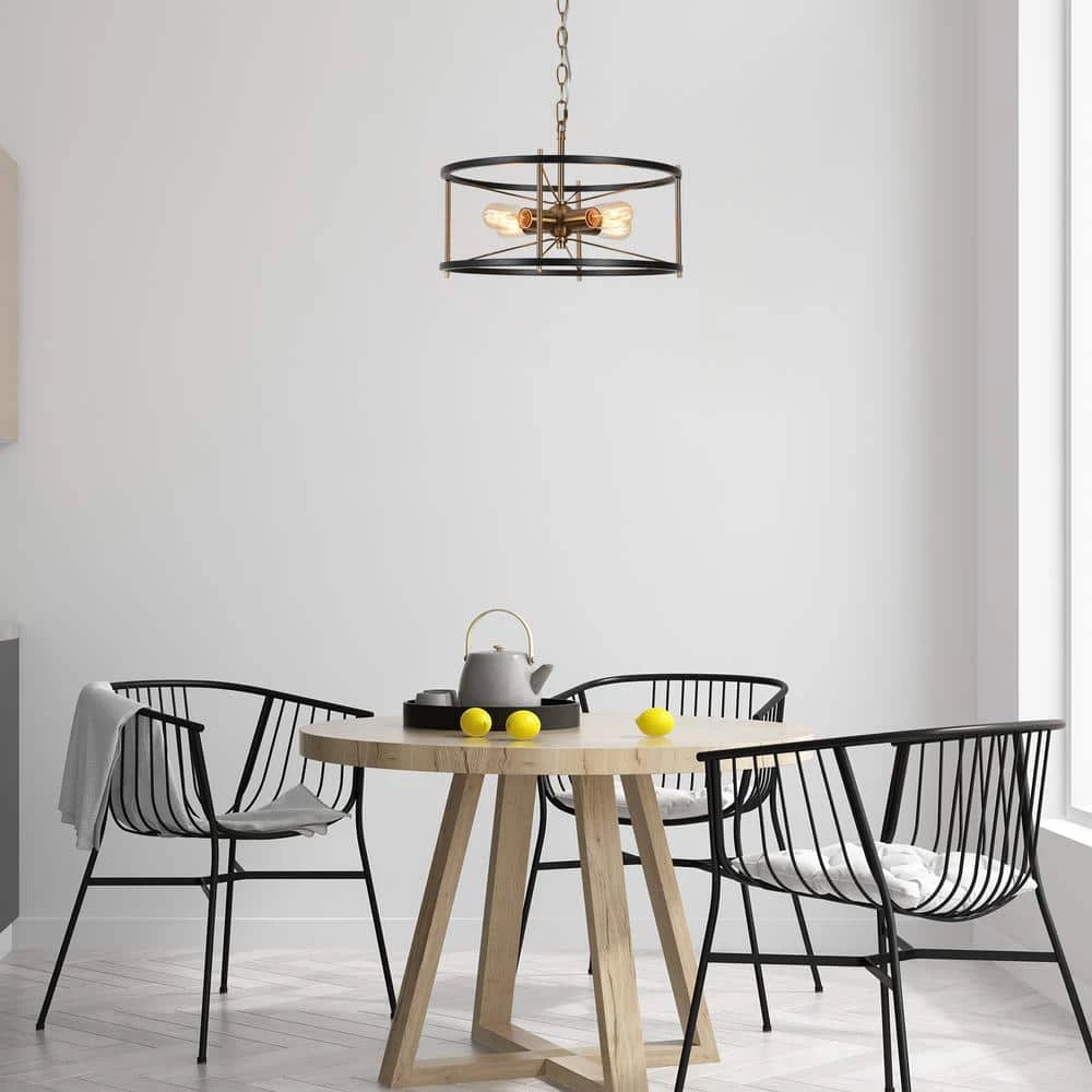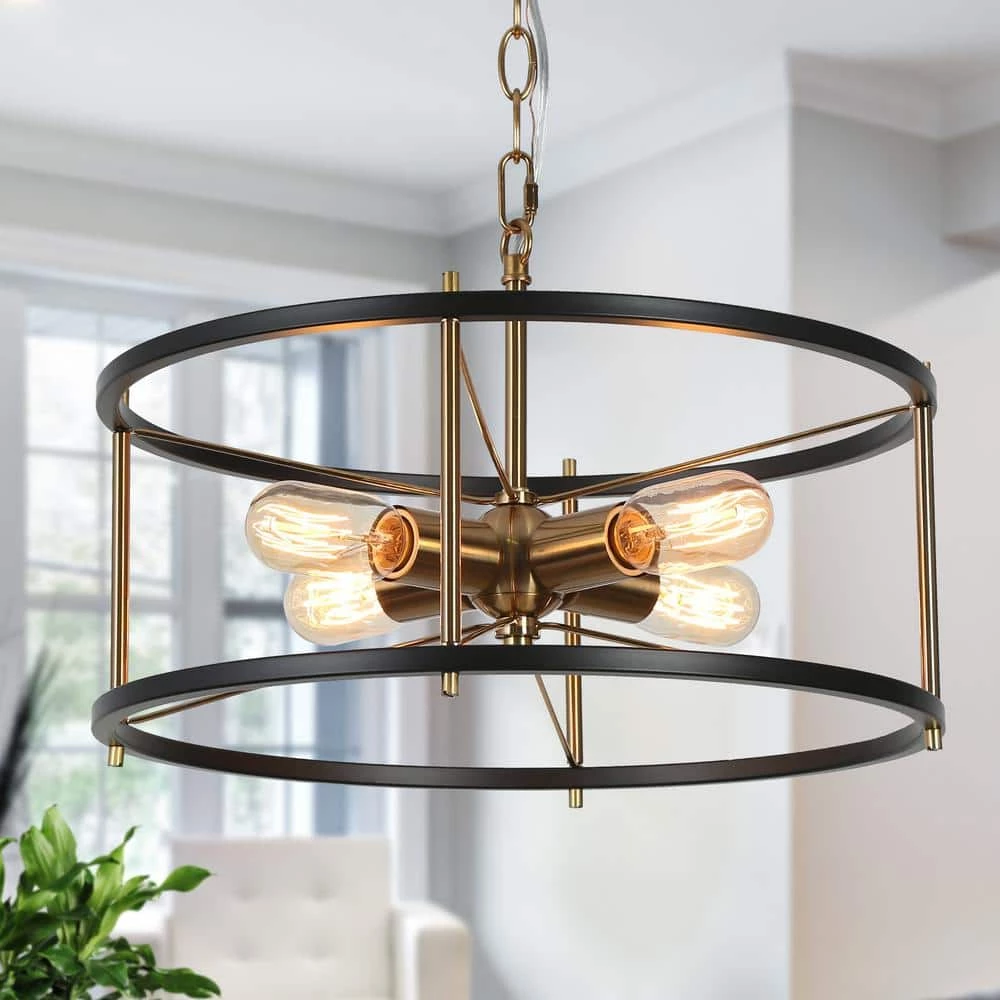 Blending modern and industrial elements, this 4-light round chandelier lighting complements various house decorations. Great combination of vintage black and shiny plating brass gold makes sophisticated hanging lights, enhance any house decoration. The minimalist cage design with exposed light bulbs (not included) fully embodies a sense of high simplicity as well as provides you with great convenience for installation and bulb replacement. With an adjustable gold chain, the industrial pendant hanging light will satisfy your DIY ideas, working as a functional and decorative lighting fixture to embellish and brighten your dining room, hallway, stairway, kitchen, foyer, and more.